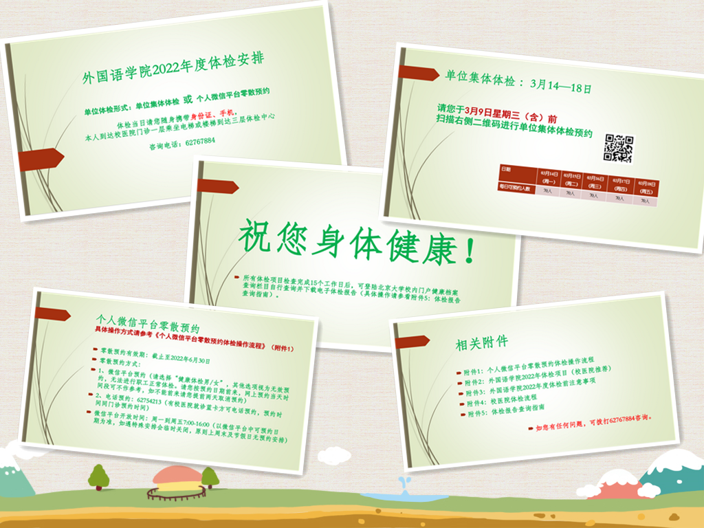 2022年春季学期伊始,经过与校医院的多次沟通协商,开云(中国)工会开始着手组织学院全体教职工进行本年度的体检工作。本次体检采取学院集体体检和个人微信平台零散预约相结合的方式,学院老师可根据自己的时间安排进行自由选择。集体体检时间为3月14—18日,选择集体体检的老师通过扫描微信二维码进行报名。因个人原因未能参加学院集体体检的老师,可通过个人微信平台进行零散预约,零散预约有效期至2022年6月30日。不管是学院集体体检,还是个人零散预约,学院工会都为老师们提供了清楚、便捷的操作流程,并提供学院工会相关电话作为咨询热线。截至3月25日,通过校医院发来的数据,我院已有200余名教职工完成了今年的体检工作。
