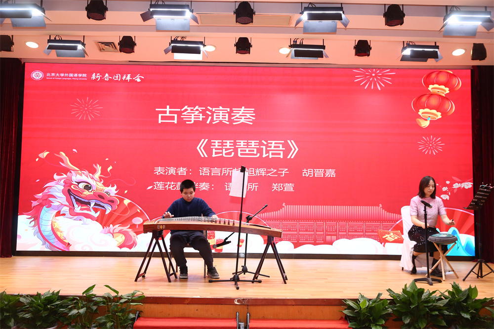 团拜会还安排了丰富多彩的文艺表演和互动环节。日语系同学杨谦锐带来快板《玲珑塔》,伶俐的口齿、顿挫的调子、脆快的板声引得掌声连连。英语系研公英副教授程英演唱歌曲《春风十万里》,用美声带领观众饱览祖国大好河山。日语系博士后王天驰、向伟带来能乐选段《清经》,展现了日本传统戏剧之美。朝韩语系外教朴智娟和她的学生共同演唱韩语歌曲《我对于你,你对于我》,温暖人心的曲调展现出双向奔赴的师生情,令人动容。伴随着俄语系教授查晓燕和特邀嘉宾邹京力老师悠扬的手风琴声,英语系研公英教授李淑静和俄语系副教授张海燕带来经典英语歌曲《雪绒花》和经典俄语歌曲《纺织姑娘》。欣赏着女声二重唱的动人旋律,观众的心情也变得温暖而幸福。语言所助理教授郑萱带来吉他弹唱《岁岁》,轻柔的吉他声与感情充沛的歌声相融合,让歌中蕴含的情感更具感染力。语言所长聘副教授胡旭辉之子胡晋嘉小朋友为大家带来古筝演奏《琵琶语》,郑萱以莲花鼓伴奏,清丽婉转的金石丝竹之声如清泉缓缓流泻全场,滋润听众心田。南亚学系副教授姜永红深情演唱歌曲《如愿》,表达了一代人的愿景,也传递出感动与力量,激励我们去传承、去拼搏。即将退休的语言所教授高一虹为大家带来舞蹈《手之语:花开花落》。纤巧的手法与身法、步法巧妙结合,优雅、轻柔的中国古典舞身韵让人心旷神怡。画风一转,英语系大学英语退休教授黄必康高亢嘹亮的男高音划破长空,慷慨激昂地演唱《沁园春·雪》,雄浑的嗓音和精湛唱功令人心潮澎湃。