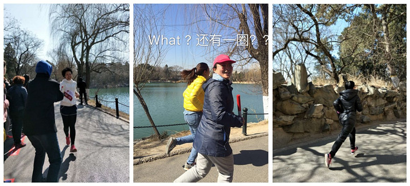 38日中午,校工会组织了“北京大学女教工环湖接力跑”活动,全校共组织了200多支队伍、1200名女教职工参加,盛况空前。活动形式为6人一组的环湖跑,第1棒完成环湖跑2圈后,将接力棒交给下一个队员,余下5名队员各自完成环湖跑1圈,共计7圈视为完成。单圈距离约0.9公里,7圈合计约6公里。