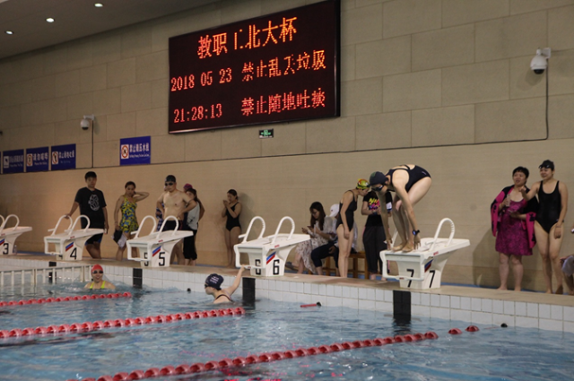 5月23日晚,比赛在邱德拔体育馆举行。在女子100米蛙泳比赛中于施洋老师霸气外漏,毫无悬念地获得了该项目的第一名;在男子50米自由泳的比赛中,王京老师仅以0.06秒之差屈居该项目的第九名。二位老师在比赛中充分发扬了积极向上、奋勇拼搏的精神。让我们为她们的精彩表现喝彩!(文/李宁 图/朱博雅)