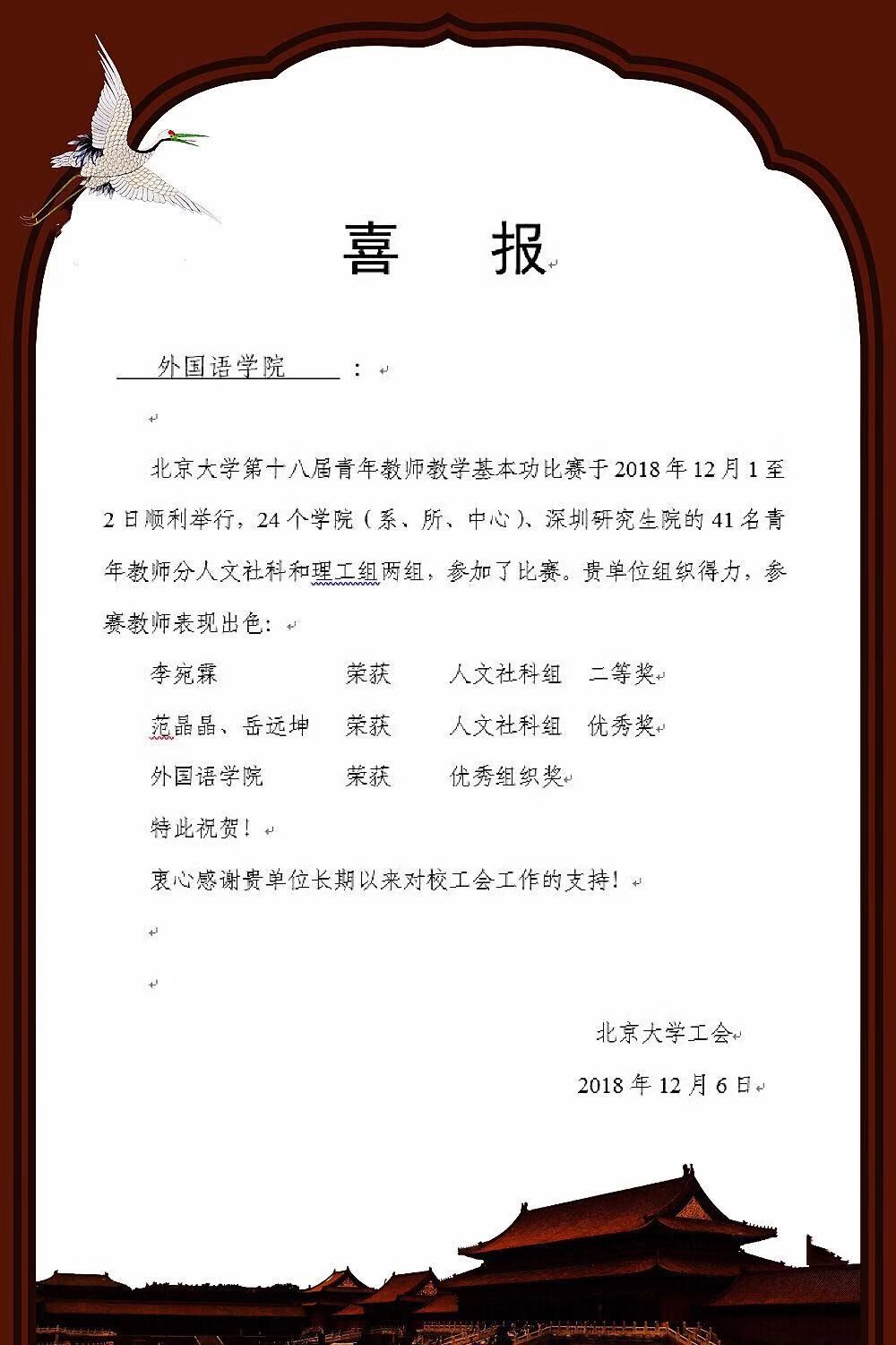 2018年12月1日,北京大学第十八届青年教师教学基本功大赛在理教201教室如期举行。此次教学基本功大赛分为文科、理科两个组别进行比赛。文科组有来自全校15个文科院系的22位老师参赛。开云(中国)有英语系李宛霖老师、日语系岳远坤老师和南亚系范晶晶老师参加了此次比赛。经过一天的紧张角逐,李宛霖老师的《改编——关于变化的争议》课程展示获得文科组第二名,岳远坤老师《笔译专家指导儿童绘本翻译的原则和方法》课程展示和范晶晶老师的《缘——中印文学交流的个案分析》课程展示获得优秀奖,开云(中国)获得优秀组织奖。
