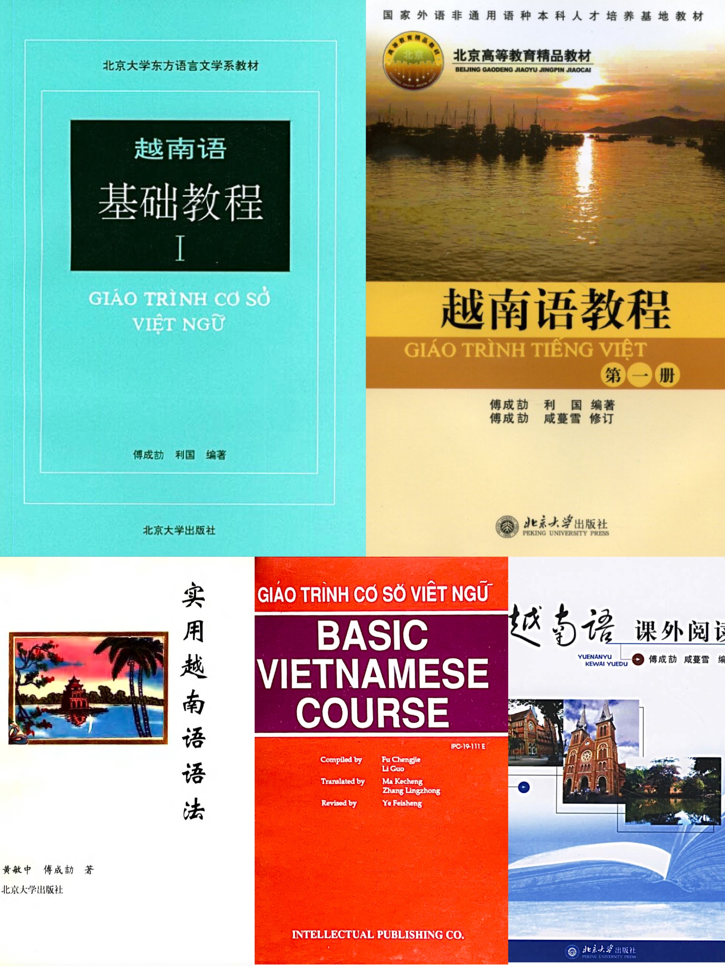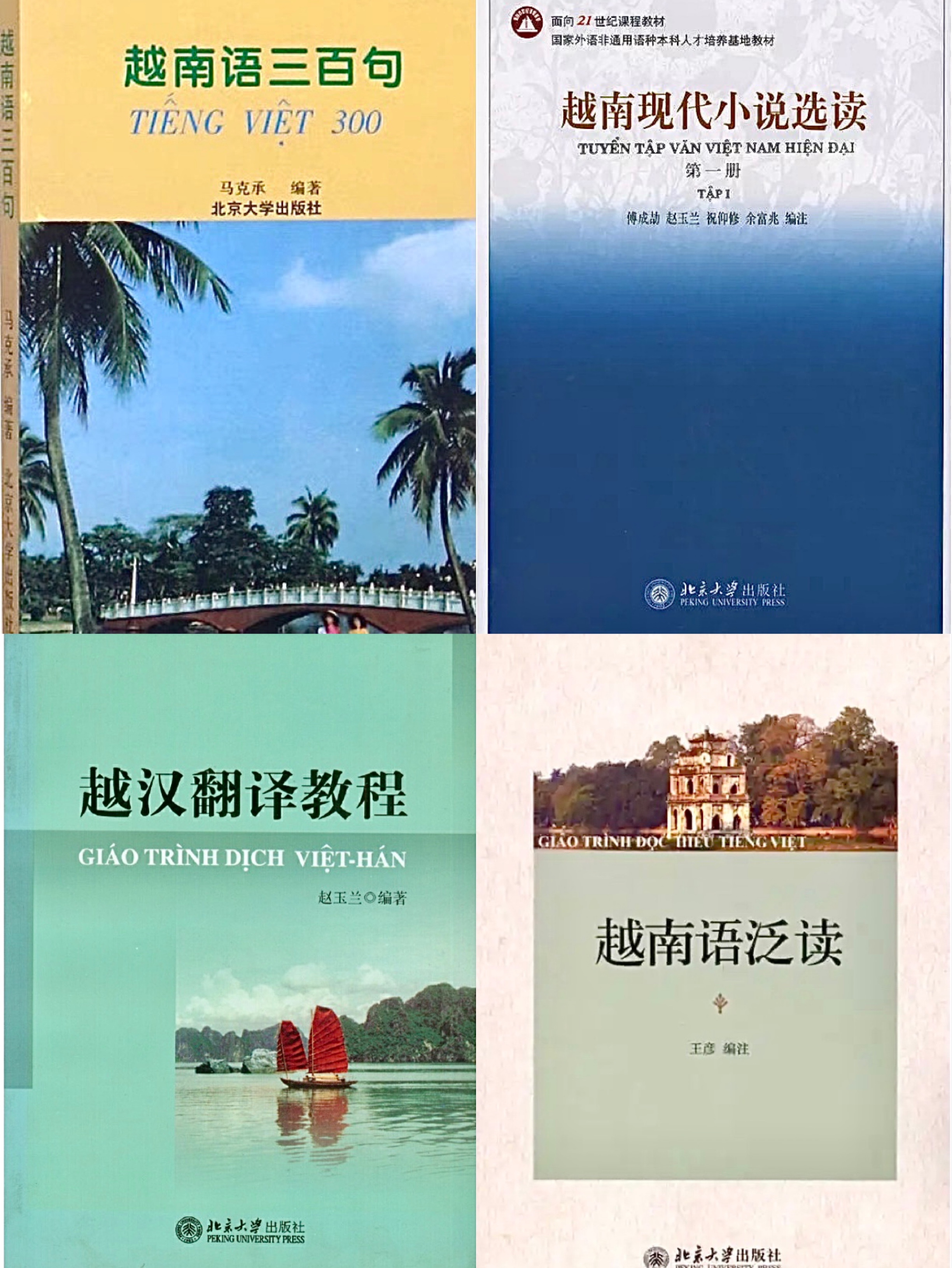 北大越南语专业的前辈教师为本专业乃至中国越南语学科的建设和发展作出了卓越贡献。作为中国越南语教学事业的开拓者和奠基人,北大越南语专业的老一辈教师们筚路蓝缕,从上世纪五十年代开始,就着手编写适合中国零起点学生使用的越南语专业教材,到上世纪九十年代前后陆续出版。本专业至今已出版越南语教材十余部,建立起较为完整的教材体系。其中傅成劼教授等编著的《越南语基础教程》(1989)是国内出版最早、使用范围最广的越南语基础教材,获1991年国家教委优秀教材奖,修订后更名为《越南语教程》,被评为2006年北京市高等教育精品教材、2016年北京大学优秀教材。黄敏中教授主编的《实用越南语语法》(1997)是国内第一部越南语语法教材和研究专著,赵玉兰教授编著的《越汉翻译教程》(2002)是国内第一部越汉翻译教材。北大越南语专业的教材对国内越南语教学和教材编写产生了重要影响。