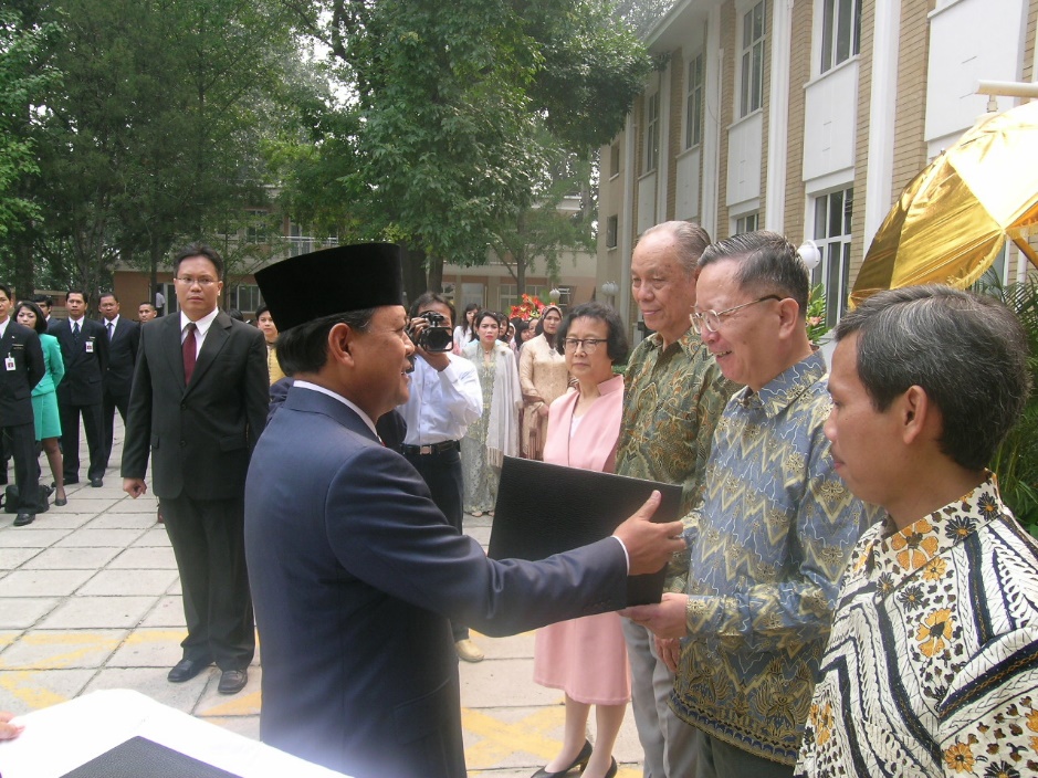 2006年梁立基教授(右三)、孔远志教授(右二)获得由印度尼西亚驻华大使苏德拉查(Sudrajat)颁发的“贡献奖”