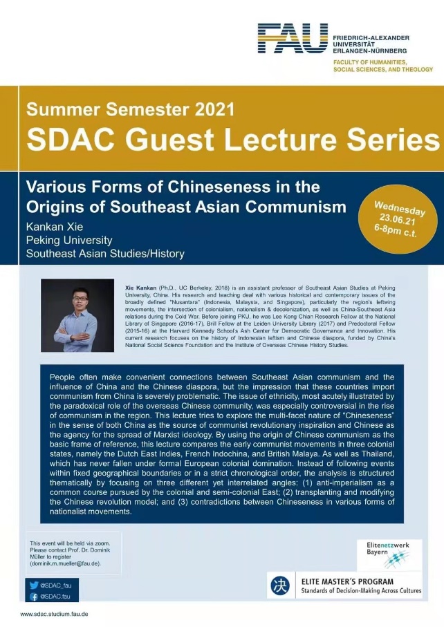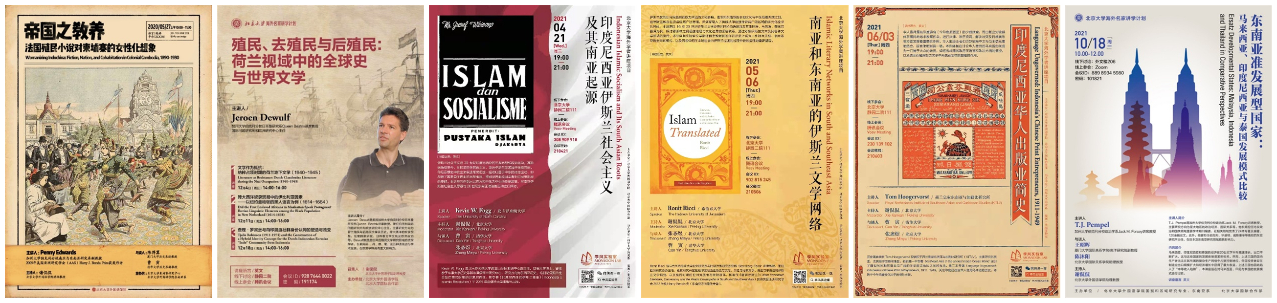 分别邀请美国加州大学伯克利分校教授Jeroen Dewulf、美国加州大学伯克利分校政治系讲席教授T.J. Pempel、美国加州大学伯克利分校南亚与东南亚研究系副教授Penny Edwards和Sylvia Tiwon、美国卡罗来纳大学教堂山分校亚洲中心副主任Kevin William Fogg、荷兰皇家东南亚与加勒比研究所(KITLV)研究员Tom Hoogervorst、以色列希伯来大学亚洲研究系与比较宗教研究系Sternberg-Tamir双聘讲席教授Ronit Ricci、马来西亚翻译与创作协会会长、马来西亚汉文化中心主席拿督吴恒灿(Dato’Goh Hin San)、马来西亚拉曼大学副教授郑文泉(Tee Boon Chuan)等著名学者为北京大学学生举办多场专题学术讲座。