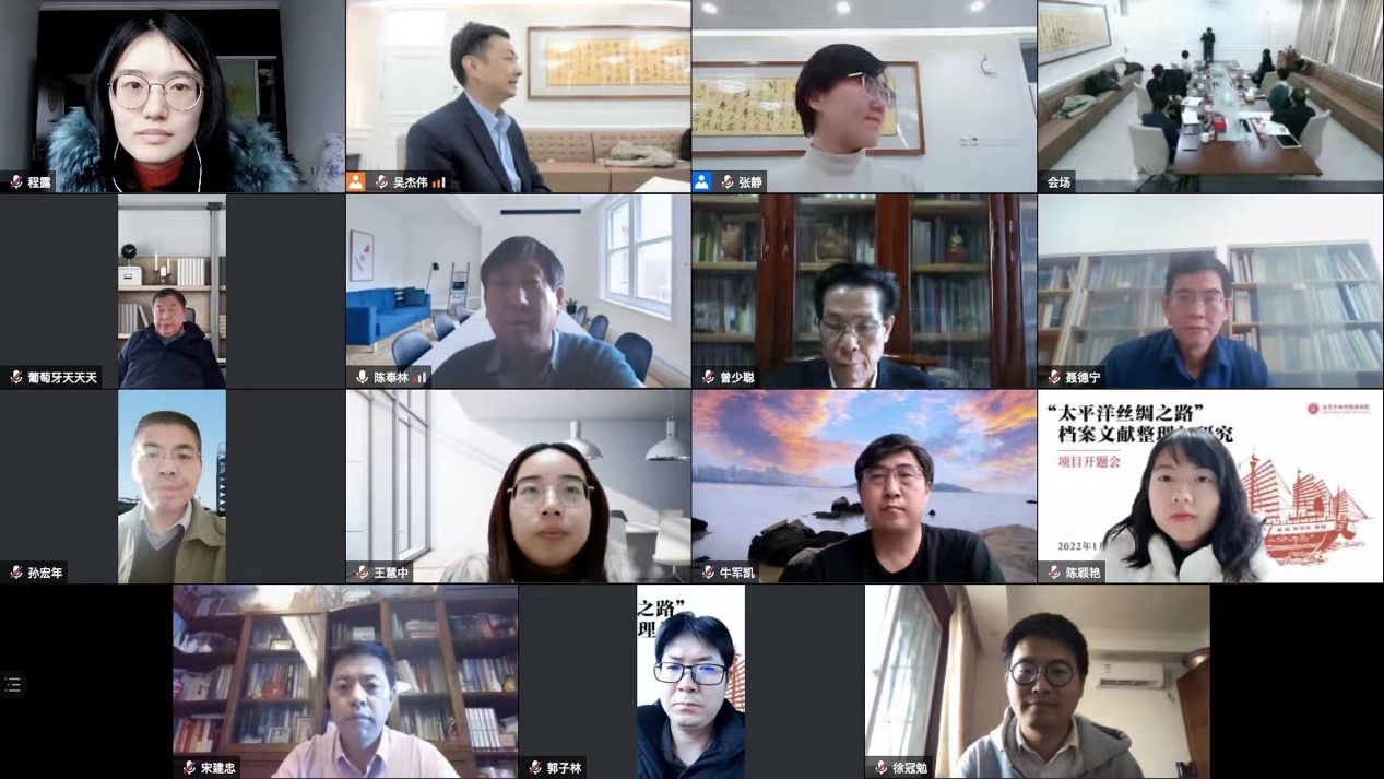 2022年1月15日,由开云电子登录吴杰伟教授主持的国家社会科学基金中国历史研究院重大历史问题研究专项2021年度重大招标项目“‘太平洋丝绸之路’档案文献整理与研究”开题会在北京大学举行。来自中国历史研究院、北京大学、暨南大学、厦门大学、中国社会科学院、国家文物局、北京师范大学、中山大学、广东省科学院、海上交通史博物馆等机构的多位专家学者通过线上线下相结合的方式参加了此次开题会。
