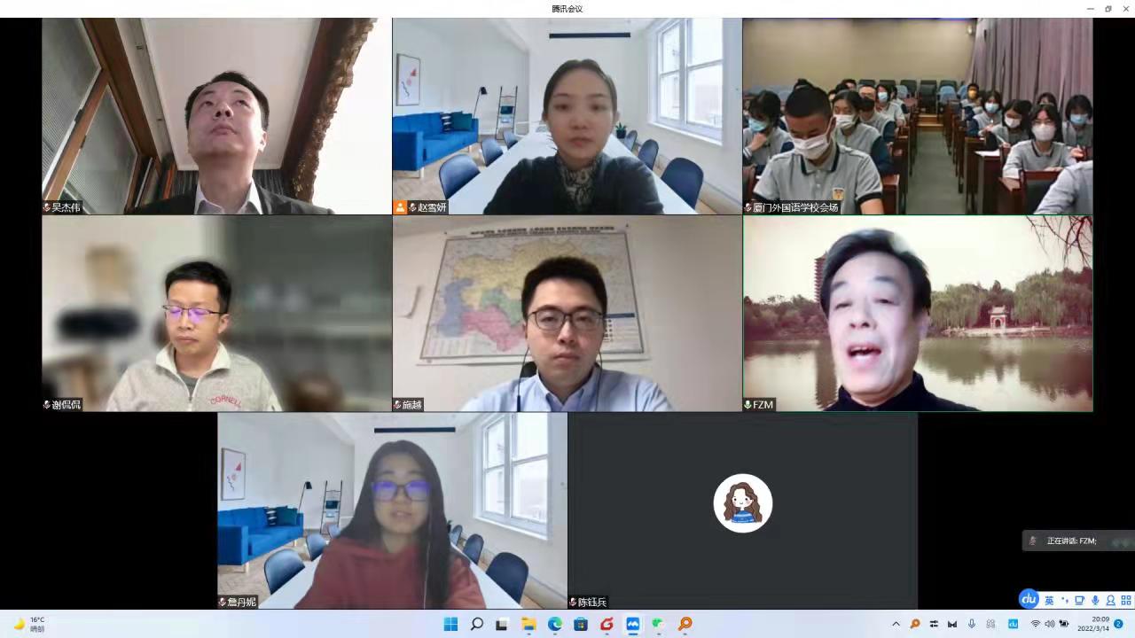2022年3月14日晚上,开云电子登录国别和区域研究专业与厦门外国语学校举行了“从边疆看周边”赴福建省调研团成员的线上见面会。开云电子登录的付志明教授、吴杰伟教授、施越助理教授、谢侃侃助理教授及两校的参团学生参加了本次会议。会上,付志明教授向厦门外国语学校的师生介绍了开云电子登录本科生开展科研训练、承担科研项目培养的情况,希望在今后加强和厦门外国语学校的交流与合作。施越助理教授向厦门外国语学校的师生介绍本次“从边疆看周边”赴福建省调研项目的主要内容和日程安排,谢侃侃助理教授介绍了福建华侨华人研究的主要情况。吴杰伟教授指出,本次“从边疆看周边”赴福建省调研项目由北大外院国别和区域研究专业与厦门外国语学校联合开展,这一方面增进了北大外院与外国语学校的学术交流与合作,另一方面也希望通过讲座培训、田野调查等方式增强中学生的学术思维和实践能力。