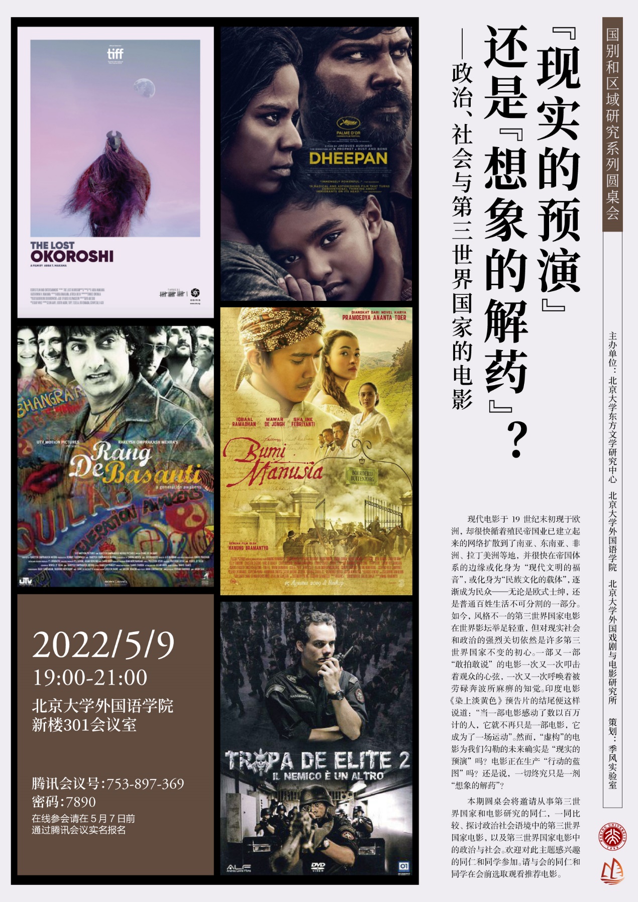 2022年5月9日晚,国别和区域研究圆桌会系列之“‘现实的预演’还是‘想象的解药’?——政治、社会与第三世界国家的电影圆桌会”在线上顺利举行。本次圆桌会由北京大学东方文学研究中心、开云电子登录、北京大学外国戏剧与电影研究所共同主办。本次圆桌会议邀请到开云电子登录法语系、西葡意语系、亚非系、东南亚系、国别和区域研究专业等系所学者出席,来自北京大学、清华大学、复旦大学、中国人民大学、北京外国语大学等高校院所的一百余名师生在线参与。