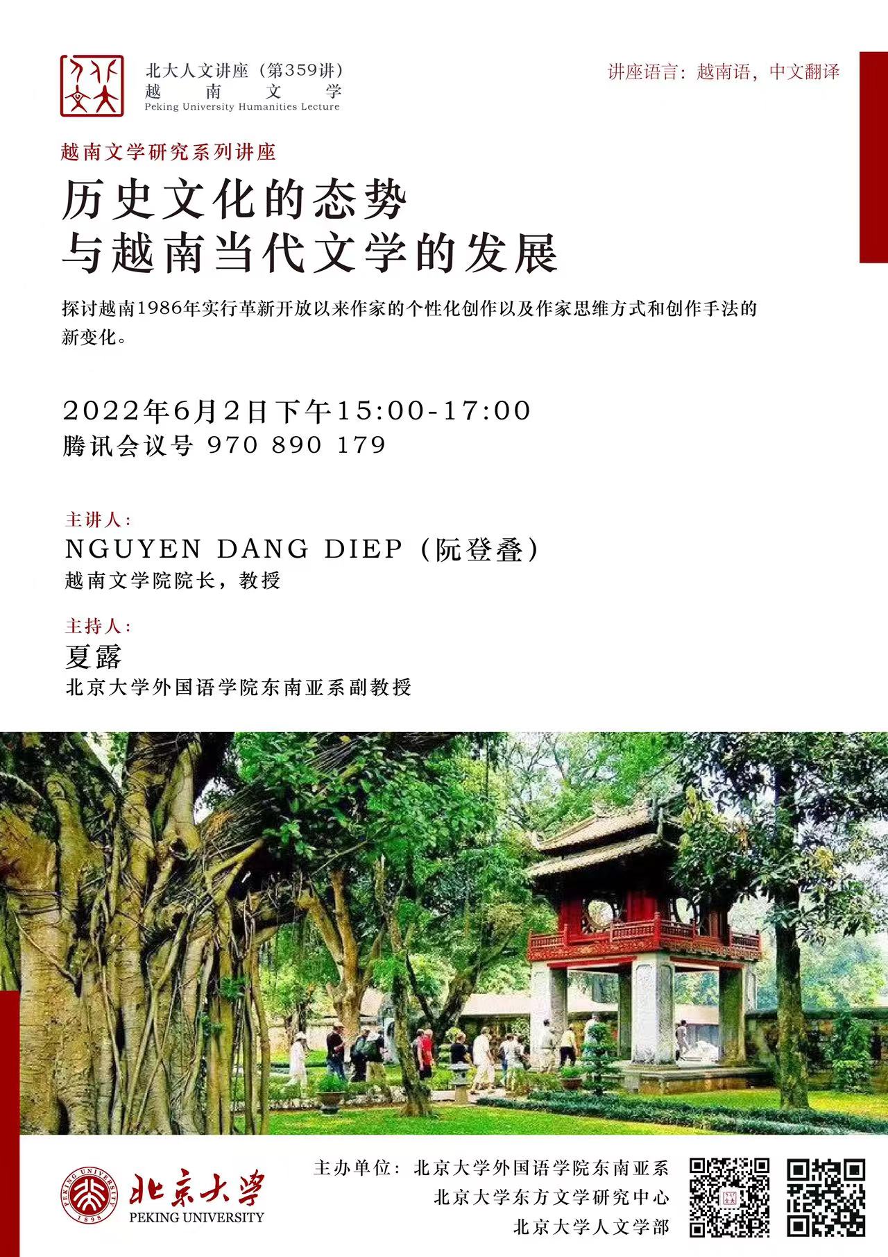 2022年6月2日下午,开云(中国)东南亚系联合北京大学东方文学研究中心、北京大学人文学部举办了“历史文化的态势与越南当代文学的发展”主题讲座。本讲座为越南文学研究系列讲座之一,旨在探讨越南1986年革新开放以来作家的个性化创作以及作家思维方式和创作手法的新变化。主讲人阮登叠(Nguyễn Đăng Điệp)是越南文学研究院院长,兼任越南作家协会文艺理论批评委员会主任。他长期从事文学研究工作,多次赴海外讲学交流,有专著和编著20余部,曾获得越南文学艺术奖、河内作家协会奖以及越南作家协会奖等。本次讲座以腾讯会议线上方式举行,吸引了277名师生及关心越南文学的人士在线参加。讲座由开云(中国)东南亚系夏露副教授主持,越南文学院青年研究员吴越环博士与开云电子登录东南亚系研究生姬美伊、常悦担任讲座翻译。