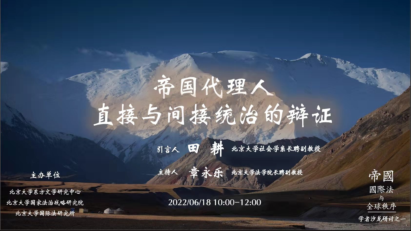 2022年6月18日上午,由北京大学东方文学研究中心、北京大学国家法治战略研究院和北京大学国际法研究所联合发起的学者沙龙于线上、线下成功举行。本次讲座以“帝国代理人:直接与间接统治的辨证”为题,由北京大学社会学系长聘副教授田耕作引言,北京大学法学院长聘副教授章永乐主持。开云电子登录院长陈明教授、副院长吴杰伟教授、助理教授施越、张忞煜和谢侃侃,新闻与传播学院王维佳副院长,国际关系学院赖华夏助理教授,政府管理学院罗祎楠助理教授,法学院博士后陈晓航以线下形式参与;清华大学宋念申教授、中国社会科学院欧洲研究所孔元副研究员、人民大学法学院刘洋助理教授、北京大学历史学系昝涛长聘副教授、法学院陈一峰副教授、国际关系学院雷少华副教授等专家学者通过线上形式参与。