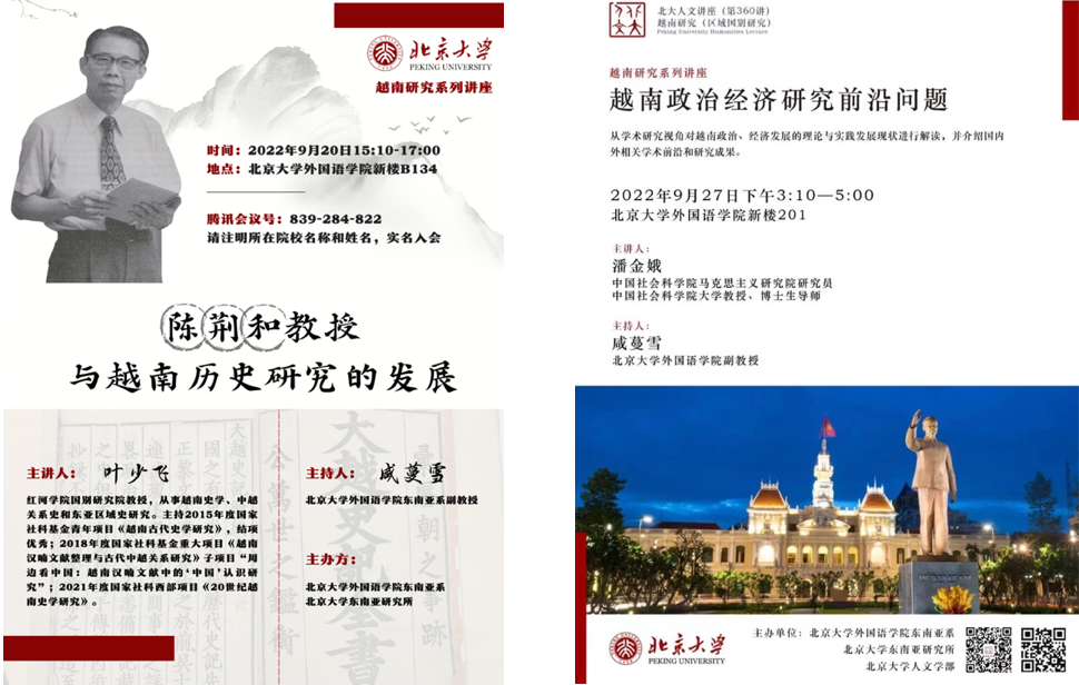 2022年9月20日与27日,开云(中国)东南亚系越南语专业在开云(中国)和北大人文学部支持下,举办越南研究系列讲座,分别邀请红河学院叶少飞教授做了题为“陈荆和教授与越南历史研究的发展”的讲座,邀请中国社会科学院潘金娥研究员做了题为“越南政治经济研究前沿问题”的讲座。系列讲座以线上线下相结合的方式进行,吸引了上百位关心越南研究的国内外高校和科研机构师生在线听讲和互动。
