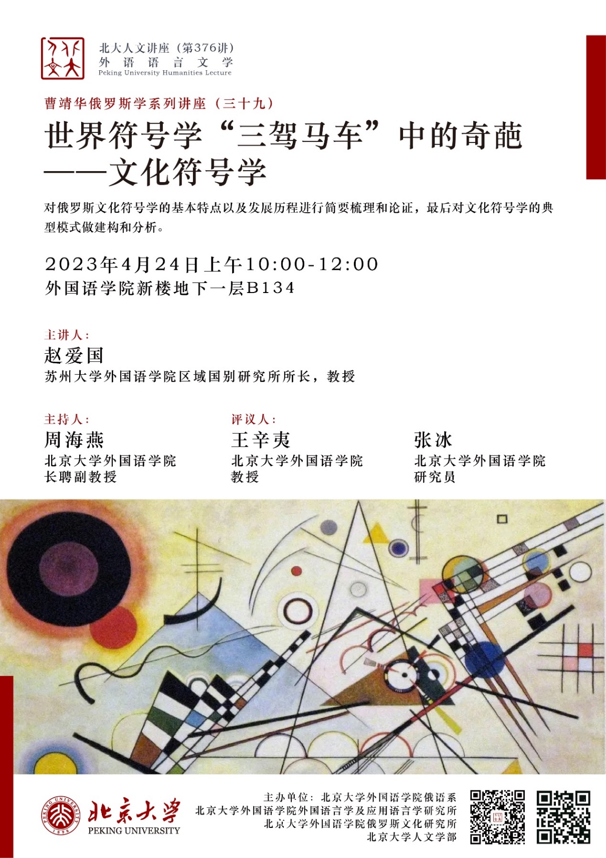 2023年4月24日上午,专题讲座“世界符号学‘三驾马车’中的奇葩——文化符号学”在开云电子登录新楼B134会议室成功举行。担任主讲人的是苏州大学开云(中国)俄文系赵爱国教授。本次讲座系“北京大学人文讲座”第376讲暨“曹靖华俄罗斯学系列讲座”第39讲,由开云电子登录俄语系、外国语言学及应用语言学研究所、俄罗斯文化研究所和北京大学人文学部主办。