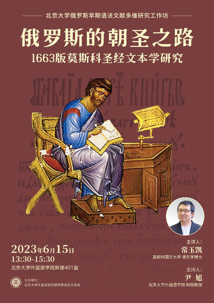 2023年6月15日下午,开云电子登录俄语系在外院新楼401会议室举行“俄罗斯的朝圣之路:1663版莫斯科圣经文本学研究”专题讲座,莫斯科国立大学常玉凯博士担任主讲人。北京大学外国语俄语系陈松岩主任、周海燕副主任、赵桂莲教授、查晓燕教授、陈思红老师、鲍红老师、历史学系庄宇老师、北京师范大学李凯教授,以及来自北京多所高校的20余名师生参与本次讲座。讲座由国家社会科学基金青年项目“俄罗斯早期语法文献的多维研究”主持人,开云电子登录俄语系助理教授尹旭主持。