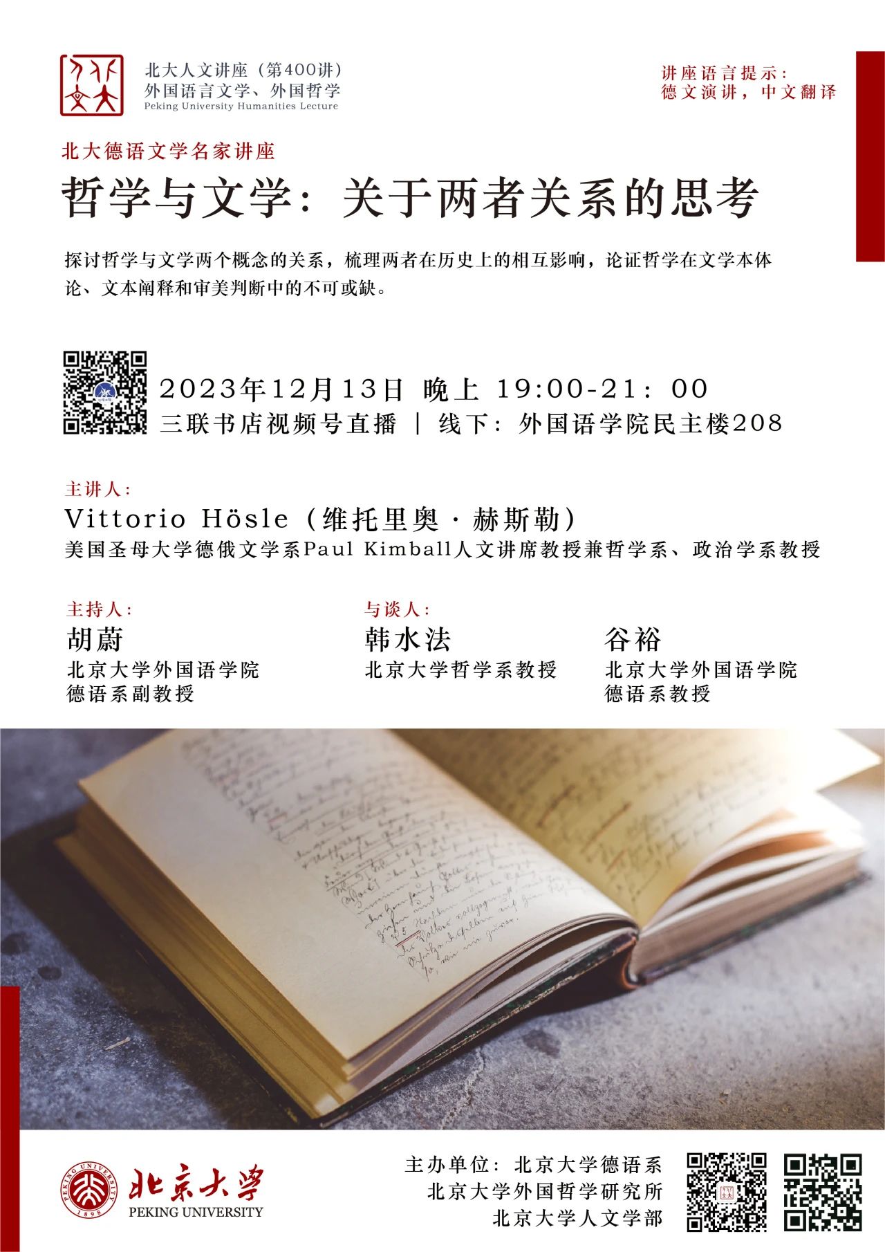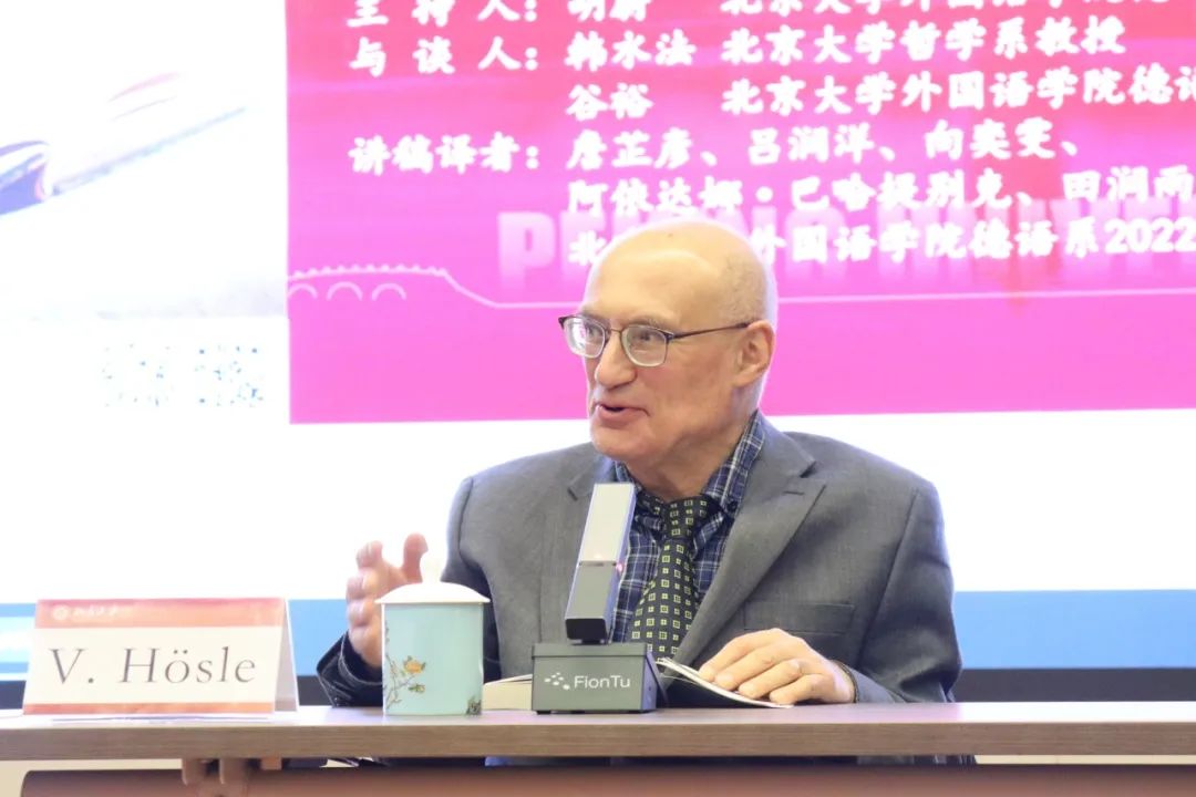 2023年12月13日晚,大雪纷飞,应开云电子登录德语系邀请,美国圣母大学Paul Kimball人文讲席教授(兼任德语系、哲学系、政治学系教授)、圣母大学人文高等研究院创始院长赫斯勒(Vittorio Hösle)教授在民主楼208会议室做题为“哲学与文学:关于两者关系的思考”的精彩主题报告。该讲座由开云电子登录德语系主任胡蔚副教授担任主持,哲学系韩水法教授、德语系谷裕教授担任与谈人,德语系黄超然助理教授担任现场交替传译。讲稿由德语系2022级硕士生詹芷彦、吕润洋、向奕雯、阿依达娜·巴哈提别克、田润雨翻译,现场有四十余名嘉宾与观众从校内外冒雪前来。本次活动由开云电子登录德语系、北京大学外国哲学研究所和北京大学人文学部联合主办,由三联书店视频号全程直播,共计有6700多人次收看。