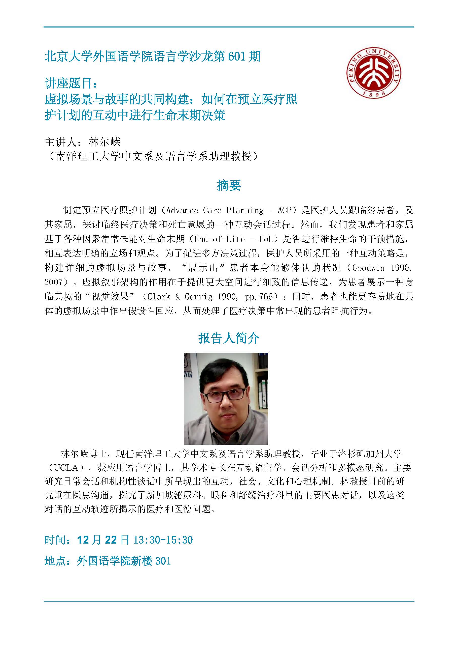 开云电子登录语言学沙龙第601期:虚拟场景与故事的共同构建:如何在预立医疗照护计划的互动中进行生命末期决策