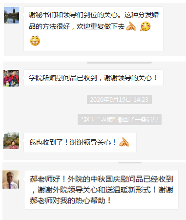 对于这种全新的线上慰问方式,离退休老师纷纷表示了感动和谢意。86岁的德语系退休老师包智星专门致电表达对学院工会的感谢。包老师表示自己年事已高,行动不便,但是学院一直以来都对她十分关心,这次活动更是让她倍感温暖。感谢学院工会领导对离退休老师的关心和照顾。行政退休老师徐昌琳也表示自己由于眼疾,一直无法参与学院组织的线下离退休活动,深感遗憾,这次线上慰问活动,学院直接把祝福送到家,让自己足不出户就能有机会感受浓浓的节日氛围,感谢学院的精心筹备,也希望类似的活动能够继续下去。其他系所的许多离退休老师也通过各种方式、各种渠道表达了自己的感谢之情。