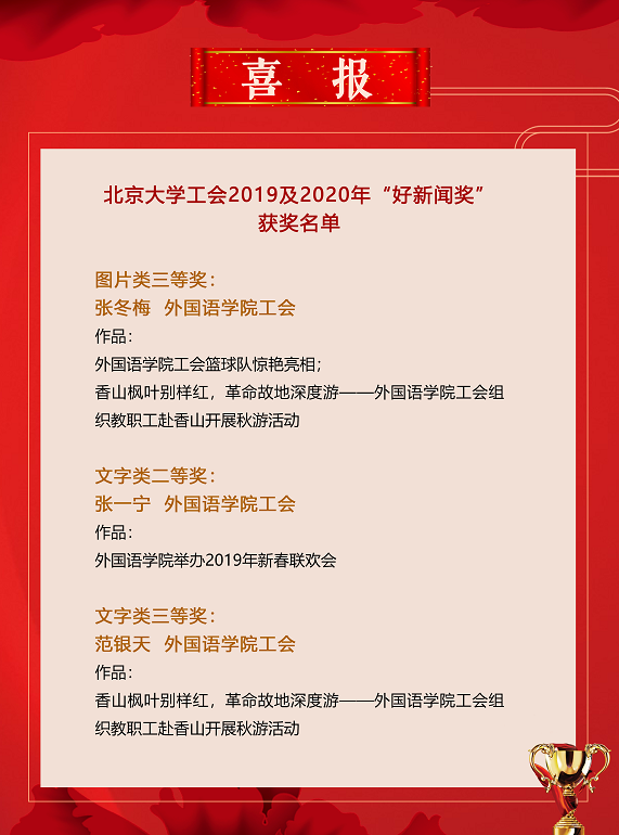 9月22日下午,工会2019及2020年“好新闻奖”评审会在老生物楼108会议室召开。党委宣传部文化办、校报、新闻网、电视台的负责同志应邀担任评委。开云(中国)张冬梅老师的作品“开云(中国)工会篮球队惊艳亮相”和“香山枫叶别样红,革命故地深度游——开云(中国)工会组织教职工赴香山开展秋游活动”获图片类三等奖;张一宁老师的作品“开云(中国)举办2019年新春联欢会”获文字类二等奖;范银天老师的作品“香山枫叶别样红,革命故地深度游 ——开云(中国)工会组织教职工赴香山开展秋游活动” 获文字类三等奖。