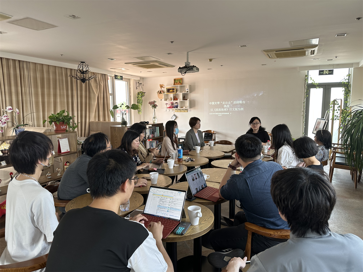 第二期活动于2023年5月26日下午在同一地点进行,主讲人为日语系古市雅子老师,朝韩语系文丽华老师,法语系段映虹、章文老师,日语系岳远坤、刘琳琳老师,西葡意语系闵雪飞、成沫老师和外国语言学及应用语言学研究所冯硕老师参加了讨论,也吸引了很多本院各专业同学的关注。古市老师作为刘慈欣小说《流浪地球》和《赡养上帝》日本版的译者,围绕“中国文学‘走出去’的困难与挑战——以《流浪地球》日文版为例”这一主题展开介绍。她从国内、国外和翻译过程本身三个方面出发,展示了译者、出版社、发行商等多个主体可能在中国文学扬帆出海的过程中所起到的作用及可能诱发的问题。在座的老师、同学们就日本翻译市场、科幻文学译介、文化负载词翻译等问题进行了交流,讲座获得圆满成功。