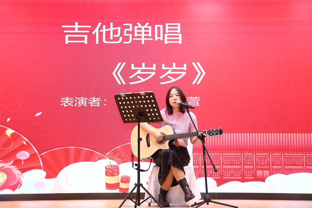 团拜会还安排了丰富多彩的文艺表演和互动环节。日语系同学杨谦锐带来快板《玲珑塔》,伶俐的口齿、顿挫的调子、脆快的板声引得掌声连连。英语系研公英副教授程英演唱歌曲《春风十万里》,用美声带领观众饱览祖国大好河山。日语系博士后王天驰、向伟带来能乐选段《清经》,展现了日本传统戏剧之美。朝韩语系外教朴智娟和她的学生共同演唱韩语歌曲《我对于你,你对于我》,温暖人心的曲调展现出双向奔赴的师生情,令人动容。伴随着俄语系教授查晓燕和特邀嘉宾邹京力老师悠扬的手风琴声,英语系研公英教授李淑静和俄语系副教授张海燕带来经典英语歌曲《雪绒花》和经典俄语歌曲《纺织姑娘》。欣赏着女声二重唱的动人旋律,观众的心情也变得温暖而幸福。语言所助理教授郑萱带来吉他弹唱《岁岁》,轻柔的吉他声与感情充沛的歌声相融合,让歌中蕴含的情感更具感染力。语言所长聘副教授胡旭辉之子胡晋嘉小朋友为大家带来古筝演奏《琵琶语》,郑萱以莲花鼓伴奏,清丽婉转的金石丝竹之声如清泉缓缓流泻全场,滋润听众心田。南亚学系副教授姜永红深情演唱歌曲《如愿》,表达了一代人的愿景,也传递出感动与力量,激励我们去传承、去拼搏。即将退休的语言所教授高一虹为大家带来舞蹈《手之语:花开花落》。纤巧的手法与身法、步法巧妙结合,优雅、轻柔的中国古典舞身韵让人心旷神怡。画风一转,英语系大学英语退休教授黄必康高亢嘹亮的男高音划破长空,慷慨激昂地演唱《沁园春·雪》,雄浑的嗓音和精湛唱功令人心潮澎湃。