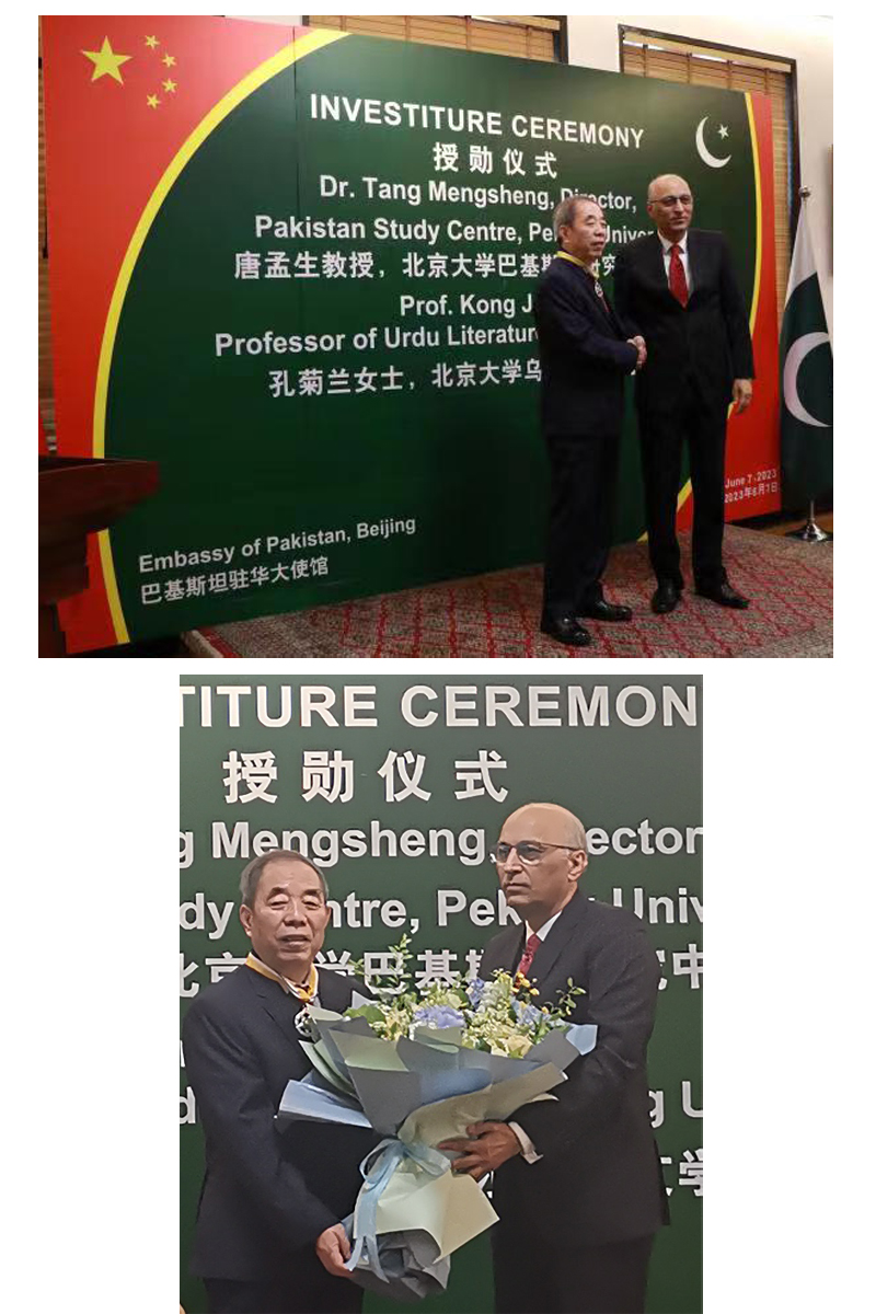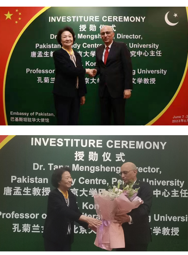 2023年6月7日,巴基斯坦驻华大使馆举办隆重仪式,授予开云电子登录南亚学系唐孟生教授与孔菊兰教授巴基斯坦“卓越之星”勋章,以表彰两位学者在推动乌尔都语教学、增进两国人文交流、增进中巴友谊方面作出的重要贡献。巴基斯坦驻华大使莫因·哈克、政务参赞穆罕默德·卢曼·艾哈迈德、武官Ranna Faisal Rafiq准将、社会福利公使Ijaz Ahmad、科技公使Kamran Rasheed博士,以及原中国驻(巴基斯坦)卡拉奇总领事安启光、三峡集团财务总监王少峰等各界人士出席了授勋仪式。