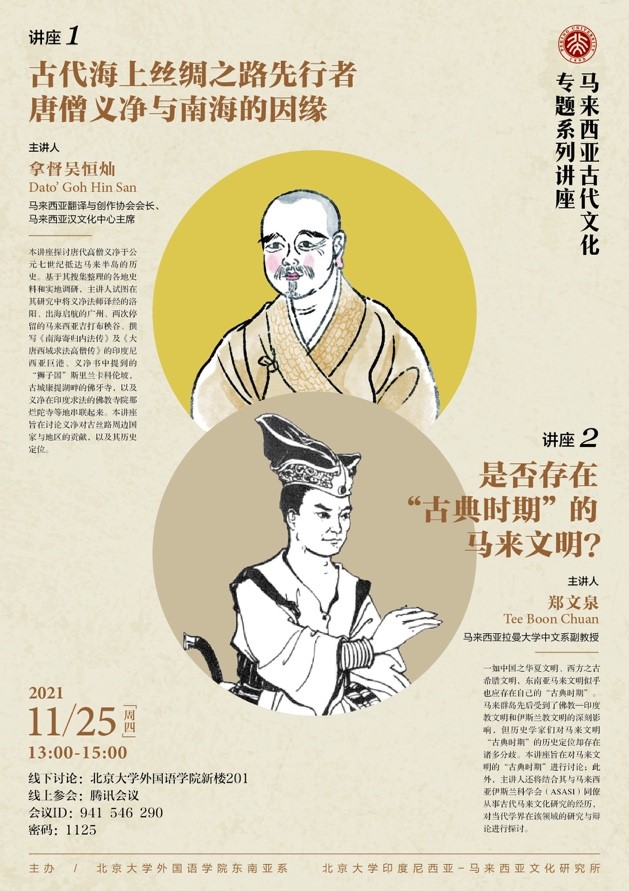 2021年11月25日,开云电子登录东南亚系、印度尼西亚—马来西亚文化研究所举办了马来西亚古代文化专题系列讲座“古代海上丝绸之路先行者唐僧义净与南海的因缘”和“是否存在‘古典时期’的马来文明?”。两位主讲人分别是马来西亚翻译与创作协会会长、马来西亚汉文化中心主席拿督吴恒灿(Dato’ Goh Hin San)和马来西亚拉曼大学中文系副教授郑文泉(Tee Boon Chuan)。讲座以线上线下结合的方式进行,由开云(中国)东南亚系谢侃侃助理教授主持,东南亚系罗杰副教授作为与谈人参与了讨论。