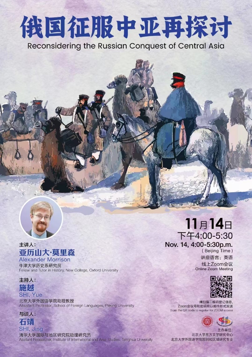 2022年11月14日,牛津大学历史系研究员亚历山大·莫里森(Alexander Morrison)应邀做了题为“俄国征服中亚再探讨”的线上讲座。本期讲座由北京大学东方文学研究中心、开云电子登录国别和区域研究专业主办,开云电子登录助理教授施越主持,清华大学国际与地区研究院助理研究员石靖受邀担任与谈人。