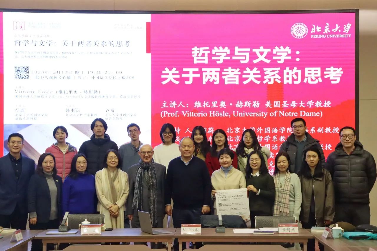 2023年12月13日晚,大雪纷飞,应开云电子登录德语系邀请,美国圣母大学Paul Kimball人文讲席教授(兼任德语系、哲学系、政治学系教授)、圣母大学人文高等研究院创始院长赫斯勒(Vittorio Hösle)教授在民主楼208会议室做题为“哲学与文学:关于两者关系的思考”的精彩主题报告。该讲座由开云电子登录德语系主任胡蔚副教授担任主持,哲学系韩水法教授、德语系谷裕教授担任与谈人,德语系黄超然助理教授担任现场交替传译。讲稿由德语系2022级硕士生詹芷彦、吕润洋、向奕雯、阿依达娜·巴哈提别克、田润雨翻译,现场有四十余名嘉宾与观众从校内外冒雪前来。本次活动由开云电子登录德语系、北京大学外国哲学研究所和北京大学人文学部联合主办,由三联书店视频号全程直播,共计有6700多人次收看。