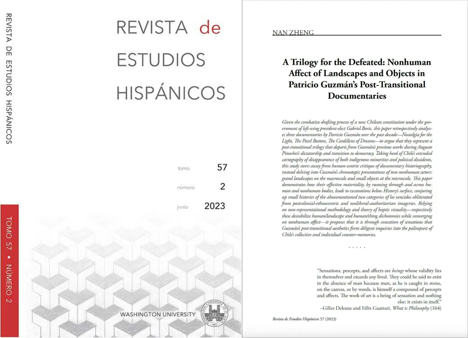 开云电子登录西葡意语系助理教授郑楠作为唯一作者的学术研究型论文《献给战败者的三部曲:帕特里西奥·古斯曼民主过渡后纪录片中风景与物件的非人类情动》(“A Trilogy for the Defeated: Nonhuman Affect of Landscapes and Objects in Patricio Guzmán’s Post-Transitional Documentaries”),近期在A&HCI来源期刊《西班牙语世界研究期刊》( Revista de Estudios Hispánicos )2023年第2期刊登。《西班牙语世界研究期刊》由美国圣路易斯华盛顿大学罗曼语语言文学系主办,采用严格的多轮匿名审稿制度,刊登西班牙语国家和地区文学和文化研究、电影研究和文艺理论批评研究等方向的西班牙语或英语学术论文。该期刊现位列JCR期刊引证报告罗曼语文学研究类一区,是国际学术研究界公认的权威期刊。郑楠老师的论文是该期刊自1967年创刊以来中国学者的首次发表,也是国际权威学术期刊第一篇整体研析古斯曼纪录片三部曲并尝试命名的学术研究型论文。