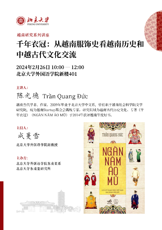 主讲人陈光德先生毕业于北京大学中文系,回国后他致力于开办汉字学习班,大力弘扬越南传统文化,开拓文化研究的新路径。2013年,他的著作《千年衣冠》问世后在越南社会中引起轰动,获评2014年越南“年度好书”,迅速售罄并多次再版,引发了越南社会探究传统服饰的热潮。