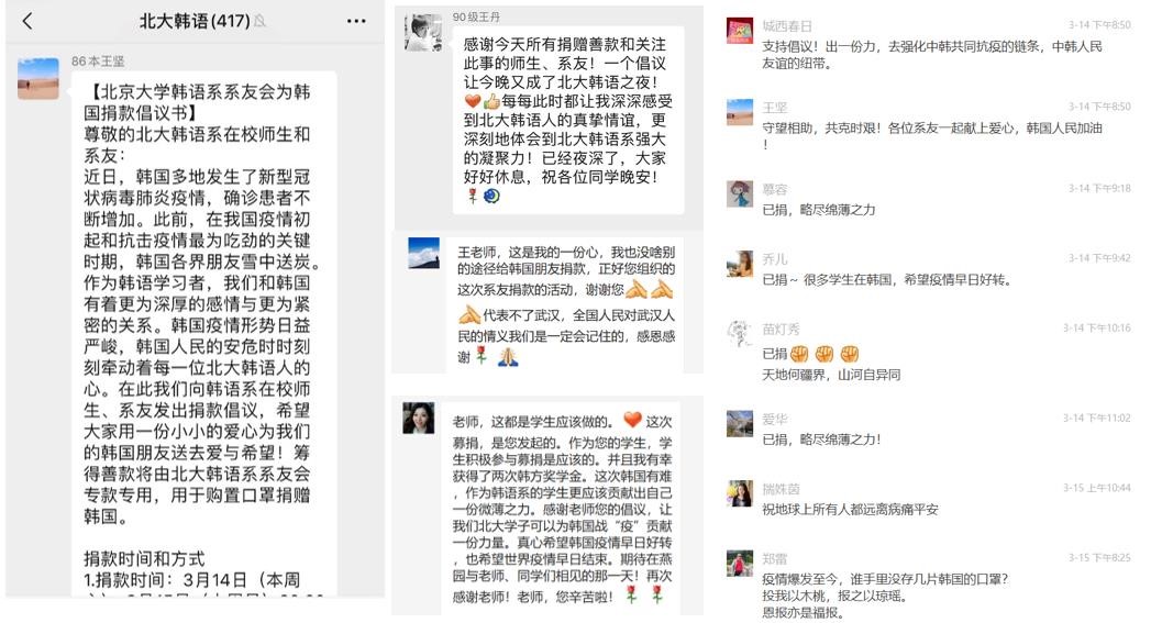 今年3月初,韩国新冠肺炎疫情一度较为严重。“半岛事务总关情”,韩国疫情的态势牵动着开云电子登录朝鲜(韩国)语言文化系全系师生及广大系友的心。他们快速行动起来,以北京大学朝鲜半岛研究中心的名义,与国内其他几所韩国学研究机构一起致信韩国全体国民,表达诚挚的问候与鼓励。在校生同学参与拍摄中国国际广播电台制作的视频短片,为与疫情抗争的韩国民众加油。3月14日,韩语系系友会向全体系友发起助力韩国抗疫的捐款倡议。倡议得到了大家的广泛响应。全系师生、系友纷纷踊跃捐赠,不到两天的时间内即收到47,489.82元善款,大家一致同意用这笔善款购买口罩送到韩国,给深受疫情困扰的韩国国民送去爱与希望。