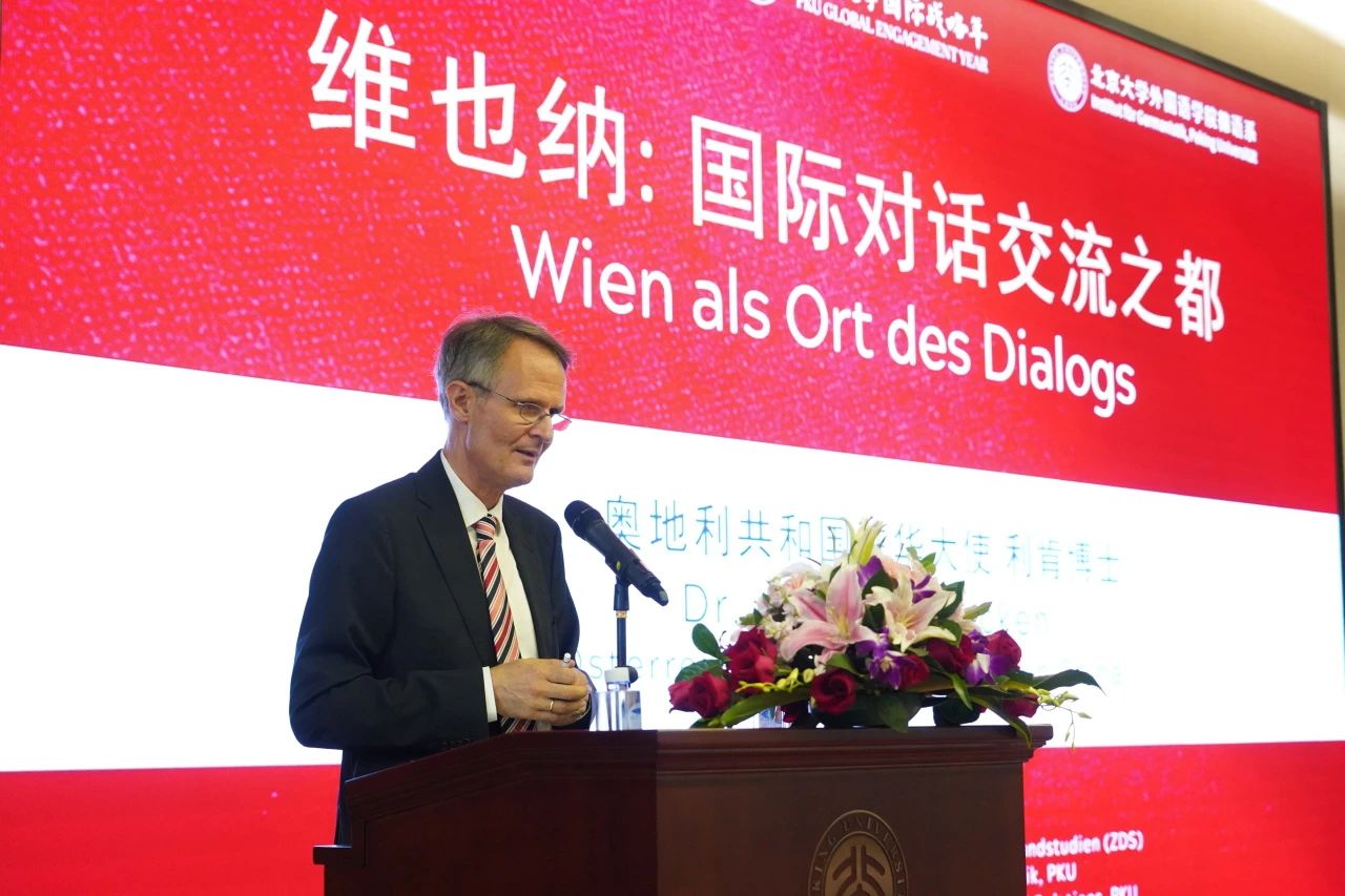 2023年9月26日下午,应北京大学德国研究中心邀请,奥地利驻华大使利肯博士(Dr. Andreas Riecken)到访北京大学,并在开云(中国)民主楼208以“维也纳:国际对话交流之都”(Wien als Ort des Dialogs)为题作演讲。活动由北京大学德国研究中心和开云电子登录德语系共同主办。作为北京大学“国际战略年”系列活动之一,本次活动得到了北京大学国际合作部大力支持。