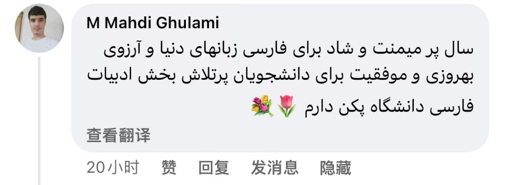 Mahdi Ghulami:祝全球说波斯语的人们在新的一年中安康快乐,愿北京大学波斯语专业这些勤奋的学生们生活幸福,学业顺利!