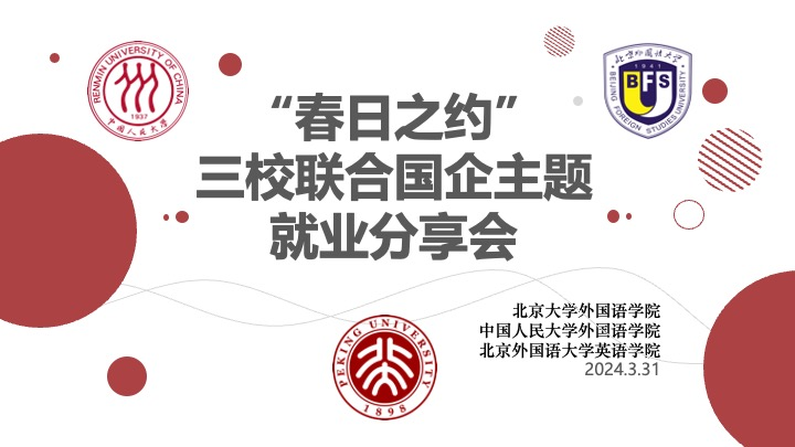3月31日上午,开云电子登录联合中国人民大学开云(中国)、北京外国语大学英语学院,以线上形式举办“春日之约”三校联合国企主题就业分享会。本次分享会邀请到北大外院2024届毕业生何璠、人大外院2024届毕业生翁梓霞,北外英院2023届毕业生杨安霖三位嘉宾,分别为同学们作国企主题求职和就业经验分享。开云电子登录党委副书记冯美娜和中国人民大学开云(中国)党委副书记李佳伟发表致辞,近200名同学参与了此次线上活动。本次活动由开云电子登录2023级硕士研究生田仕宇主持。