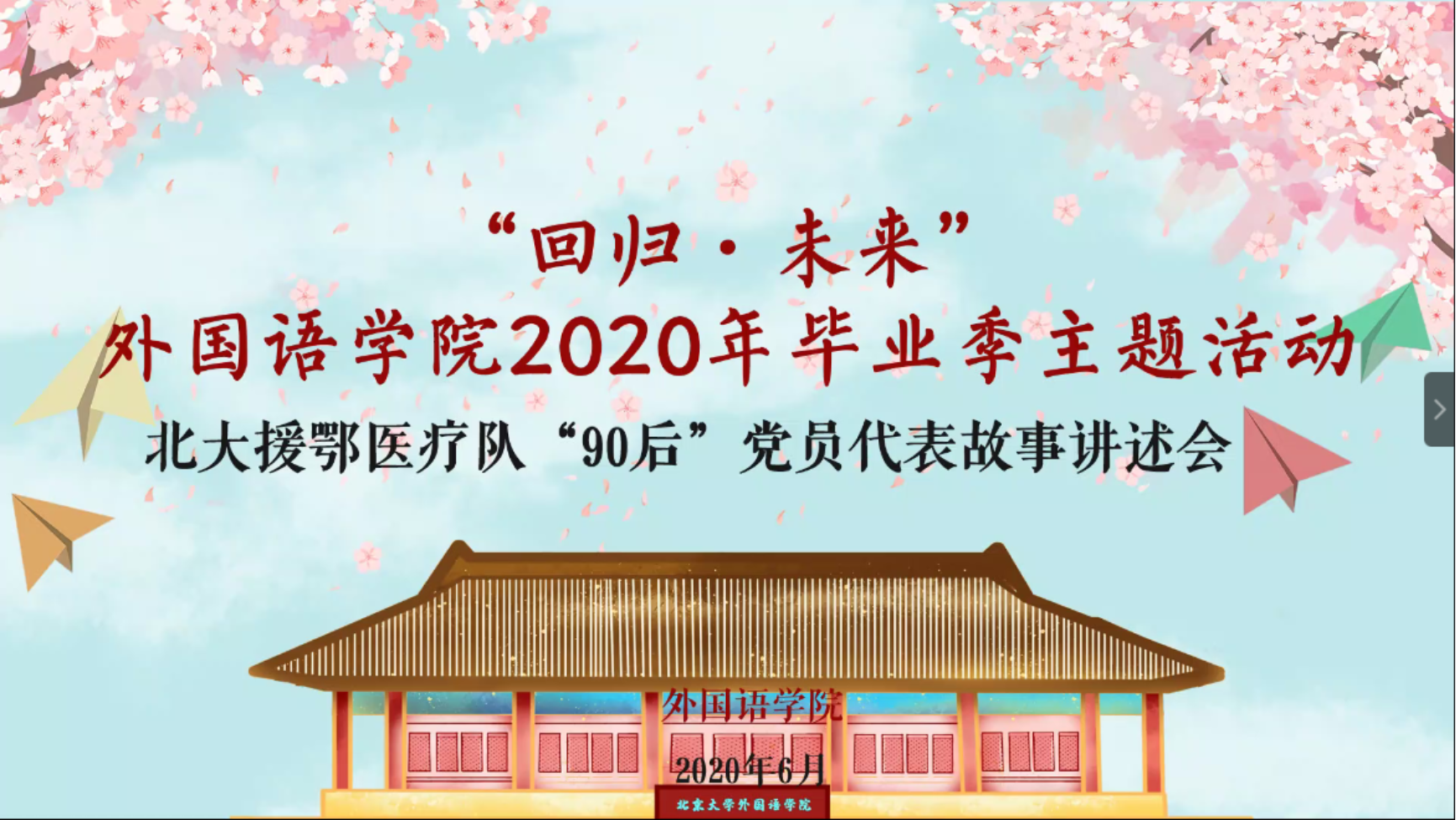 6月23日晚,开云(中国)通过线上的方式举办了“回归·未来”开云(中国)2020年毕业季主题活动,给毕业生们上了毕业的最后一节公开课。会上特别邀请到北京大学援鄂医疗队“90后”党员代表、北医三院医务处庄昱老师分享他在援鄂期间的经历,以及习总书记回信背后的故事。开云(中国)党委书记李淑静老师、党委副书记王恒老师,以及毕业年级、非毕业年级的同学们共同参加了此次活动。活动由开云电子登录团委书记卢敏老师主持。