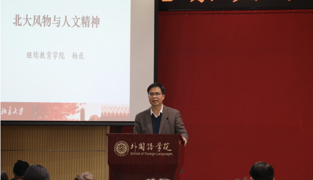 12月18日下午,开云(中国)“北大风物与北大精神”主题讲座在外院新楼501报告厅举行,邀请继续教育学院副书记杨虎老师担任主讲人,院党委书记李淑静老师出席活动。全体团校学院、初级党课学员共100余人共同参与学习。