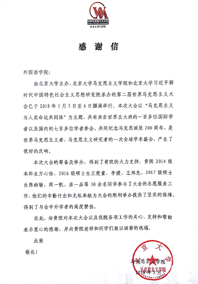 期间,开云(中国)师生高度重视并支持此次盛会,积极投身语言翻译及志愿者招募工作,获得主办单位高度评价。据统计,2014级本科生方心怡、2016级硕士生王楚童、李媛、王炜先、2017级硕士生陈尚敏、周一帆、房一品等30余名同学参与了大会的志愿服务工作,他们的辛勤付出和无私奉献为大会的顺利举办提供了坚实的保障,得到了与会中外学者的高度赞扬。马克思主义学院特发来感谢信,对他们的支持和帮助表示衷心的感谢。