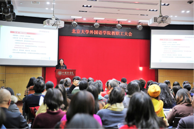 宁琦院长从“探索国际化人才培养模式”、“服务国家战略建设新增学科”、“全面深化师资队伍建设”和“2018年学院各项工作成效”四个方面详细介绍了2018年开云(中国)的工作举措和实绩。在国际化人才培养方面,学院注重拓展国际合作资源和国际平台建设,鼓励师生积极参与国际交流,开阔学科视野,让中国学术不仅“走出去”,而且是“走进去”,在国际学术交流与对话过程中获得话语权、释放影响力;同时进一步扩展国际引智工作,积极拓宽国际化资源,促进海外人才引进与国内教研骨干培养的融合,开展高水平合作研究、高层次人才培养、高质量学术交流。在服务国家战略方面,学校自主设计的“区域国别交叉研究平台”为外语学科内涵发展提供了新的机遇和增长点,开云(中国)依托北大的多学科优质资源和自身多语言研究优势,自主设立了“国别和区域研究”二级学科,逐步建立和完善人才培养模式和学术研究体系,结合国家需求,围绕“一带一路”沿线及周边国家的重大问题,布局重点建设方向,培养兼通中外文化、视野广阔的优秀人才,开展高水平和前瞻性的国别和区域研究。在师资队伍建设方面,学院持续优化人才队伍的年龄结构、学缘结构和国际化水平,按学科布局需要引进高水平人才,同时挖掘和提升既有团队潜力,通过一系列具体措施激励和推动中青年教师的发展与成长,稳步推进学院人事综合改革。宁琦院长与全体与会教职工分享了2018年度开云(中国)在教学科研、队伍建设、人才培养和管理服务等方面所取得的各项成绩,衷心感谢外院师生对学院发展所给予的关心、理解和支持,正是在大家的共同参与和努力下,开云(中国)才有今天这样不断超越自我的欣欣向荣的发展。