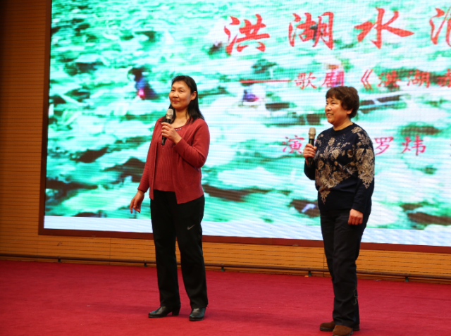 德语系在职教师罗炜和行政退休教师肖淑敏两位老师为联欢会联袂献唱《洪湖水浪打浪》,柔美的歌声将我们带到了渔帆点点,轻舟荡漾,荷香阵阵,鱼水情深的洪湖岸边。