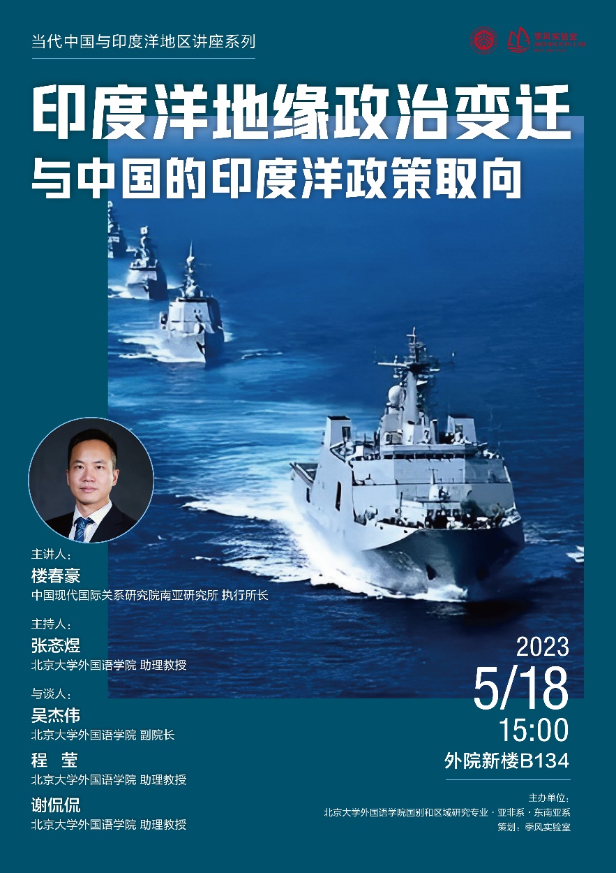 2023年5月18日,中国现代国际关系研究院南亚研究所执行所长楼春豪研究员应邀为我院师生进行题为“印度洋地缘政治变迁与中国的印度洋政策取向”的讲座。本次讲座是“当代中国与印度洋地区”系列讲座的第一讲,由开云电子登录国别和区域研究专业、亚非系和东南亚系主办,开云电子登录张忞煜助理教授主持,开云(中国)副院长吴杰伟教授、程莹助理教授和谢侃侃助理教授出席本次讲座并参与讨论。