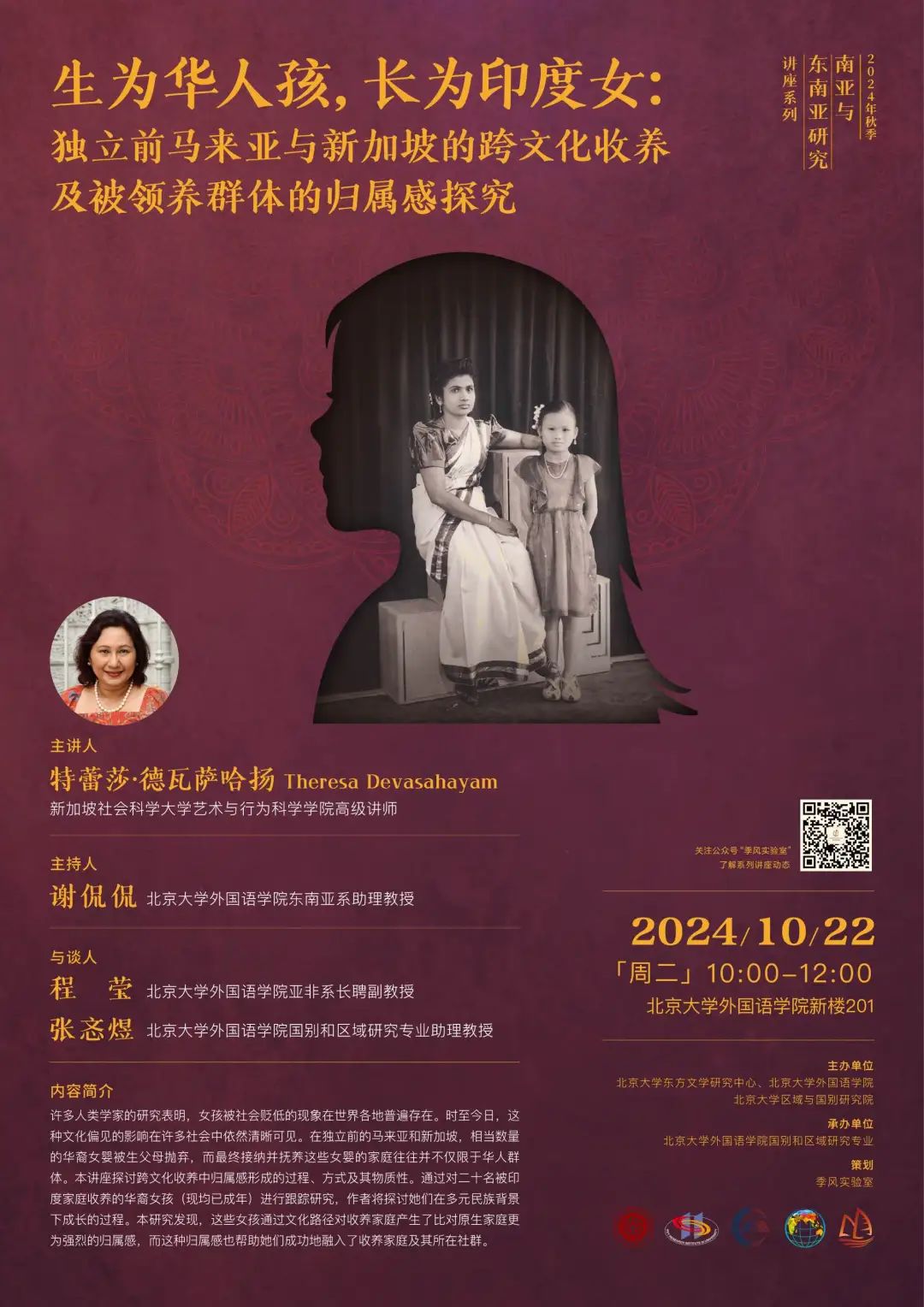2024年10月22日,新加坡社会科学大学艺术与行为科学学院高级讲师特蕾莎·德瓦萨哈扬(Theresa Devasahayam)应邀为我院师生开展题为“生为华人孩,长为印度女:独立前马来亚与新加坡的跨文化收养及被领养群体的归属感探究”的讲座。本次讲座是由北京大学东方文学研究中心、开云(中国)和区域与国别研究院主办,开云(中国)国别和区域研究专业承办的2024年秋季学期东南亚研究系列讲座之一。讲座由东南亚系助理教授谢侃侃主持,亚非系长聘副教授程莹和国别与区域研究专业助理教授张忞煜参与讨论。