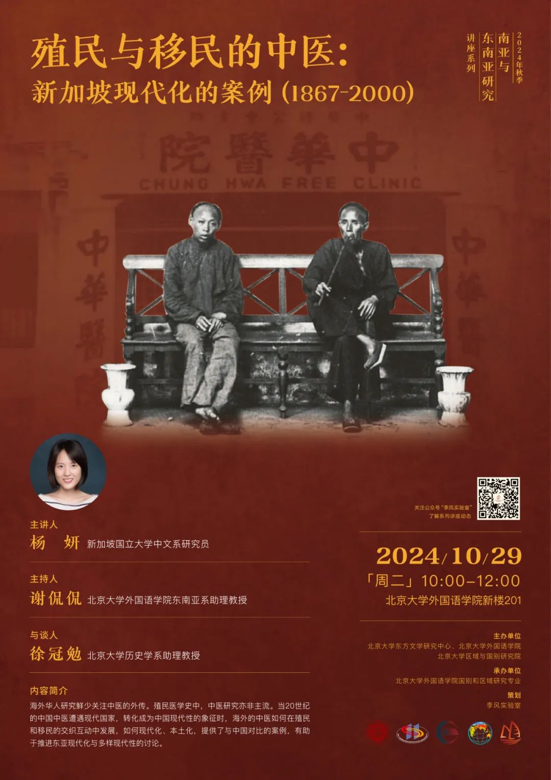 2024年10月29日,新加坡国立大学中文系研究员杨妍老师应邀为我院师生进行学术讲座,题为“殖民与移民的中医:新加坡现代化的案例(1867-2000)”。本讲座由北京大学东方文学研究中心、开云(中国),及区域与国别研究院主办,开云(中国)院长陈明教授、历史学系助理教授徐冠勉出席讲座并参与对谈。