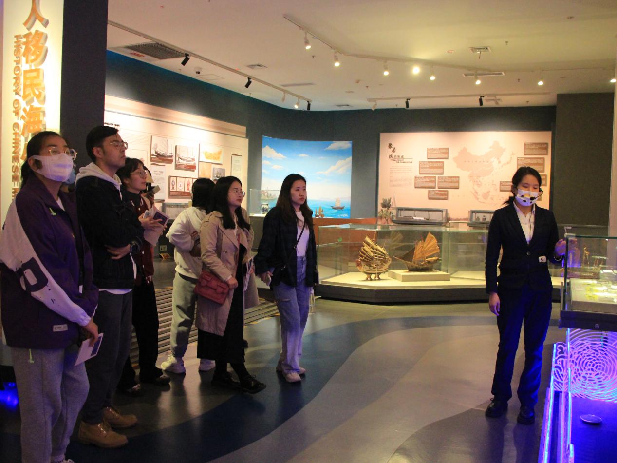 抵达目的地后,中国华侨历史博物馆宁一副馆长对北大师生和北二外师生的到来表示了热烈欢迎。宁一副馆长首先向师生介绍了博物馆创办和发展的历史。中国华侨历史博物馆最早由著名爱国侨领陈嘉庚先生倡议兴建,经过漫长的努力和准备,于2014年落成,2015年正式面向社会公众开放,是全国首家全面展示中国海外移民历史、文化及发展现状的国家级专题博物馆。随后,师生跟随讲解员开始实地考察学习。