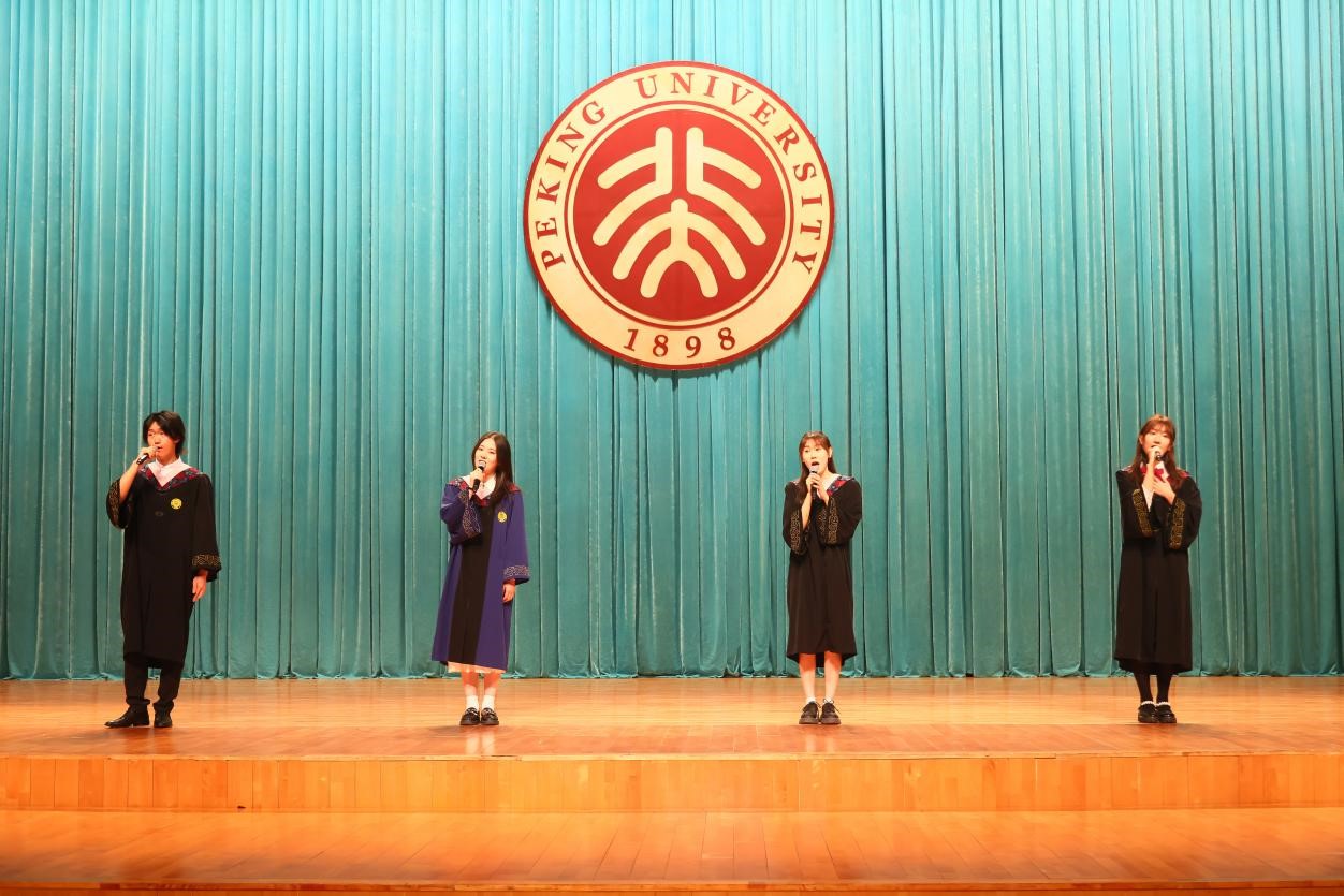 典礼行将结束,师生合唱《燕园情》。“燕园情,千千结”,联结的是所有外院人、北大人的心,不变的是真诚的师生情、同学情。“眼底未名水,胸中黄河月”,同学们将带着北大外院人的初心使命,奔赴天涯海角。