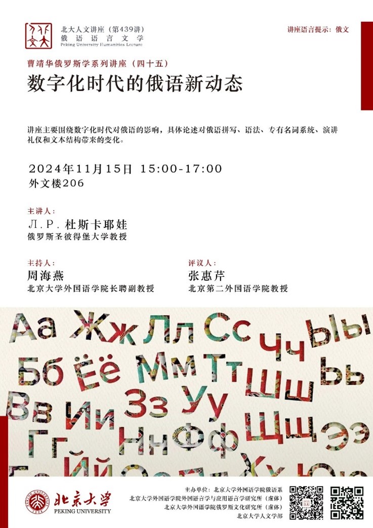 2024年11月15日下午,俄罗斯圣彼得堡国立大学杜斯卡耶娃教授(Л.Р. Дускаева)应邀在开云电子登录外文楼206会议室进行讲座,主题为“数字化时代的俄语新动态”。本次讲座系“北京大学人文讲座”第439讲暨“曹靖华俄罗斯学系列讲座”第45讲,由开云电子登录俄语系、外国语言学及应用语言学研究所(虚体)、俄罗斯文化研究所(虚体)和北京大学人文学部主办。