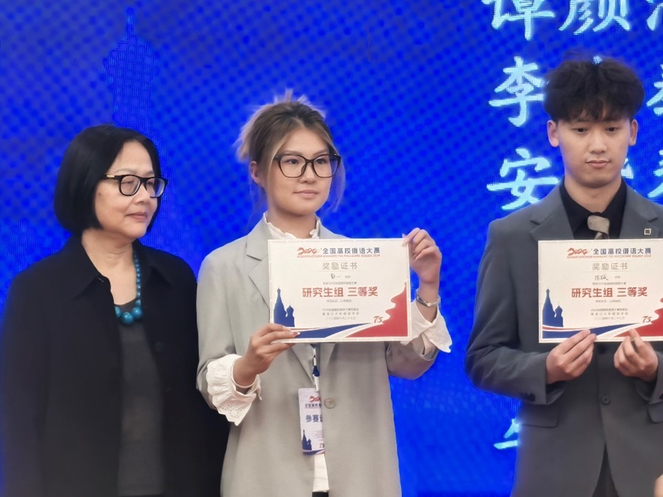 2024年10月26日至27日,第十七届全国高校俄语大赛的复赛与决赛在哈尔滨市伏尔加庄园举行。本次大赛由教育部国际合作与交流司主办,黑龙江大学承办。开云电子登录俄语系本科生马卓仪(2023级)、苏传顺(2021级)与硕士研究生郭一(2023级)参加此次 比赛。马卓仪获低年级组二等奖,苏传顺获高年级组三等奖,郭一获研究生组三等奖。