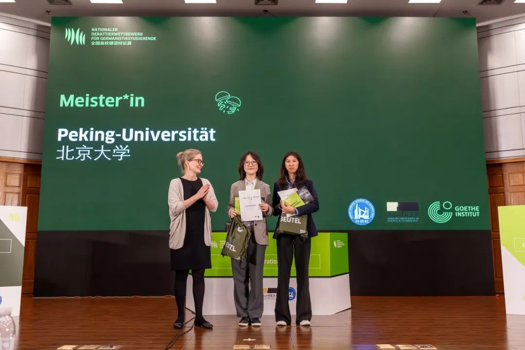 2024年11月9-16日,由北京德国文化中心·歌德学院(中国)、浙江科技大学及外语教学与研究出版社共同主办的第十四届全国高校德语系专业大学生德语辩论赛在浙江杭州圆满落幕。本项赛事历来是德语本科教学领域最为重要的赛事之一,历史悠久、备受瞩目。辩论采用双人组队、现场抽取对手、论题与正反方的规则,每场辩论前仅有10分钟的准备时间,因此对参赛选手的语言表达、逻辑思辨、临场应变等综合能力均是很大挑战。本届大赛汇聚全国44所高校的参赛队伍,采用线上预赛、线下决赛的方式举办,16支在预赛表现最为出色的队伍进入复赛阶段,而复赛则采用单败淘汰制,直至产生最后的冠军。北京大学德语系选派2021级本科生陈雨亭(一辩)与2023级本科生何海盈(二辩)搭档,经过多轮角逐,最终脱颖而出,荣膺全国冠军。