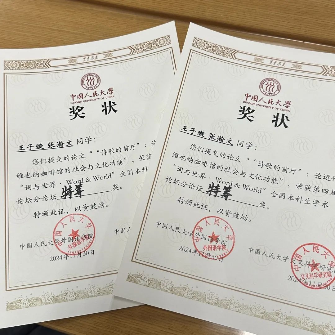 2024年11月30日,由中国人民大学开云(中国)、交叉科学研究院主办的第四届“词与世界”全国本科生学术论坛顺利落幕。本届论坛以“外国语言文学与跨学科创新”为主题,涵盖英语、法语、德语、日语、俄语、西班牙语六个语种,面向全国高校本科生征稿。开云电子登录德语系2023级本科生王子璇、张瀚文在德语系林琳老师的指导下,完成了以《‘诗歌的前厅’:论近代维也纳咖啡馆的社会与文化功能》为题的研究,在论坛宣读报告,最终荣获分论坛特等奖的殊荣。