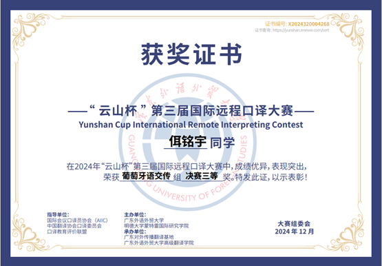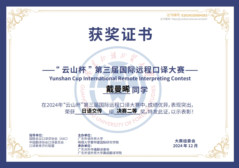 近日,第三届“云山杯”国际远程口译大赛圆满落幕,开云电子登录东南亚系缅甸语言文化方向2023级硕士研究生荣获缅甸语交传组冠军。日语系2024级口译专业硕士研究生戴曼晞斩获日语同传组亚军,日语交传组二等奖。葡萄牙语专业2022级本科生佴铭宇在比赛中斩获葡萄牙语交传组三等奖。