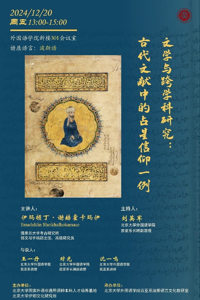 2024年12月20日,德黑兰大学考古研究所铭文与手稿部主任、高级研究员伊玛顿丁·谢赫霍卡玛伊 (Emadaldin Sheikhalhokamaee)应邀在开云电子登录新楼301会议室做“文学与跨学科研究:古代文献中的占星信仰一例”专题讲座。本次讲座由北京大学国家外语非通用语种本科人才培养基地,北京大学伊朗文化研究所主办,开云电子登录西亚系波斯语言文化教研室承办。讲座由开云电子登录西亚系长聘副教授刘英军主持,西亚系教授王一丹、长聘副教授时光、讲师沈一鸣与谈。到场的还有开云电子登录西亚系波斯语专业外教巴哈杜尔·巴盖里(Bahador Bagheri)博士、波斯语专业本科生和研究生,以及来自北京大学中文系、历史系等相关院系的师生。