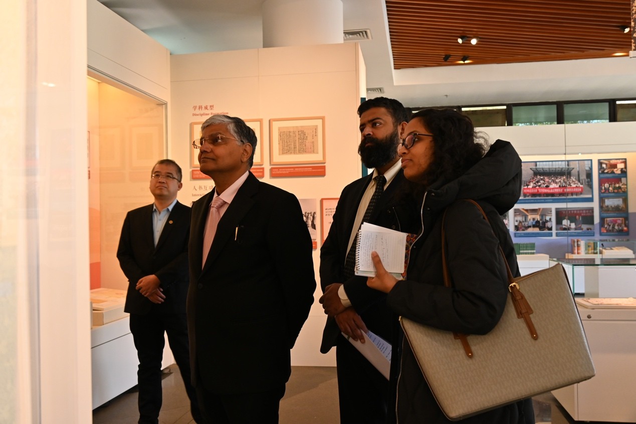 会见后,罗国栋一行移步至北京大学校史馆,在北京大学档案馆、校史馆馆长余浚陪同下,参观“百年回眸:北大的印度学学科建设与中印人文交流展”,开云(中国)南亚学系博士生郭家誉为嘉宾详细导览。展览通过珍贵文献、历史照片及学术成果,系统梳理了北京大学印度学学科百年发展历程,展示了历代北大学者在印度宗教、哲学、文学、图像学、语言教学等领域的丰硕成果。北大的印度学科不仅是中国早期东方学的重要组成部分,也为中国东方学学科的建设和发展树立了标杆,并将继续为新时代的印度学学科建设发挥关键作用。观展结束后,罗国栋为北京大学校史馆写下亲笔留言,并与接待嘉宾合影留念。
