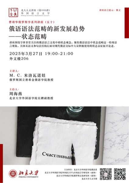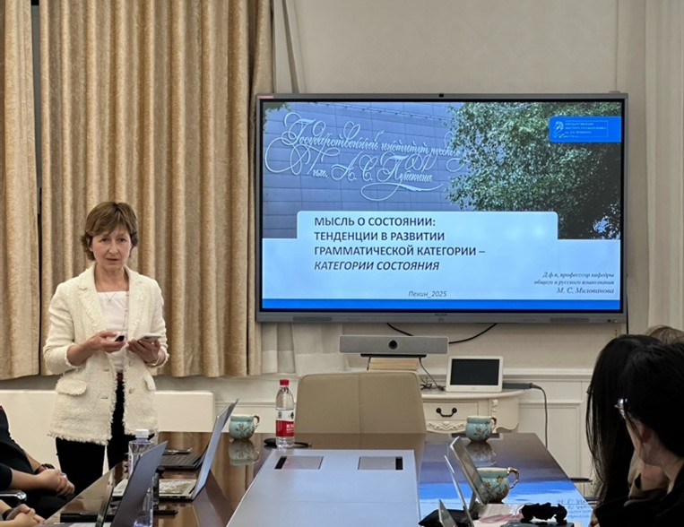 2025年3月27日晚,俄罗斯国立普希金俄语学院知名语言学家玛·斯·米洛瓦诺娃教授(М.С. Милованова)应开云电子登录邀请,于外文楼206会议室主讲“曹靖华俄罗斯学系列讲座”第50讲。本次学术活动以“俄语语法范畴的新发展趋势——状态范畴”为主题,由开云电子登录俄语系、外国语言学及应用语言学研究所(虚体)及俄罗斯文化研究所(虚体)联合主办,俄语系主任周海燕长聘副教授担任主持,俄语系教师、博士后、硕博研究生以及本科生参加讲座活动。